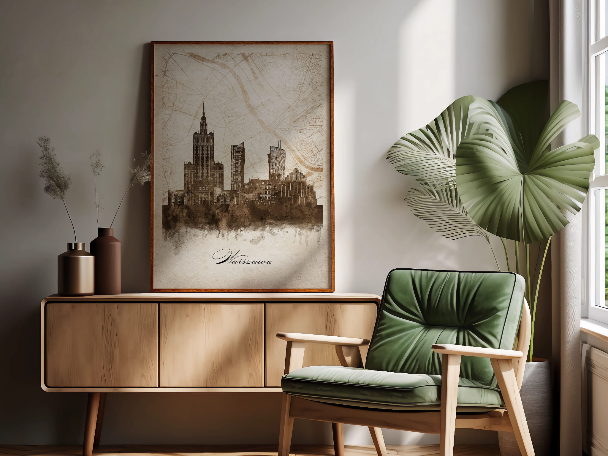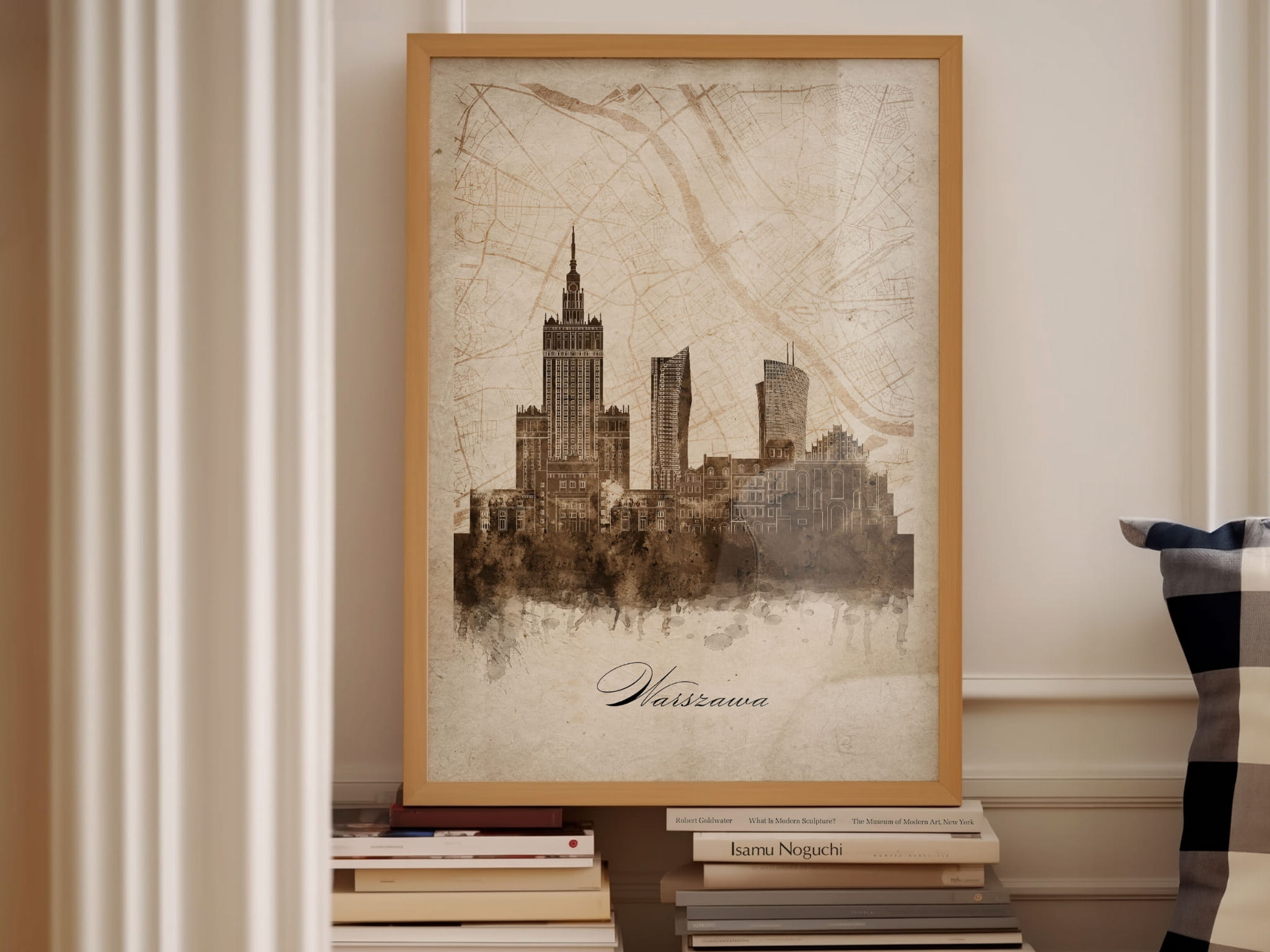 Plakaty skyline w stylu vintage to nowoczesne dzieła sztuki, które nawiązują do estetyki minionych dekad. Przedstawiają miejskie krajobrazy w retro kolorystyce, z wyblakłymi barwami i z delikatną patyną czasu. Kontury są często zmiękczone, a szczegóły budynków lekko stylizowane, co dodaje im nostalgicznego uroku. Tła plakatów utrzymane są w odcieniach przypominających stary papier, z subtelnymi teksturami i ciepłymi, przygaszonymi tonami. Całość tworzy elegancki i przytulny klimat, idealny do wnętrz, które łączą nowoczesność z klasycznym wdziękiem.
