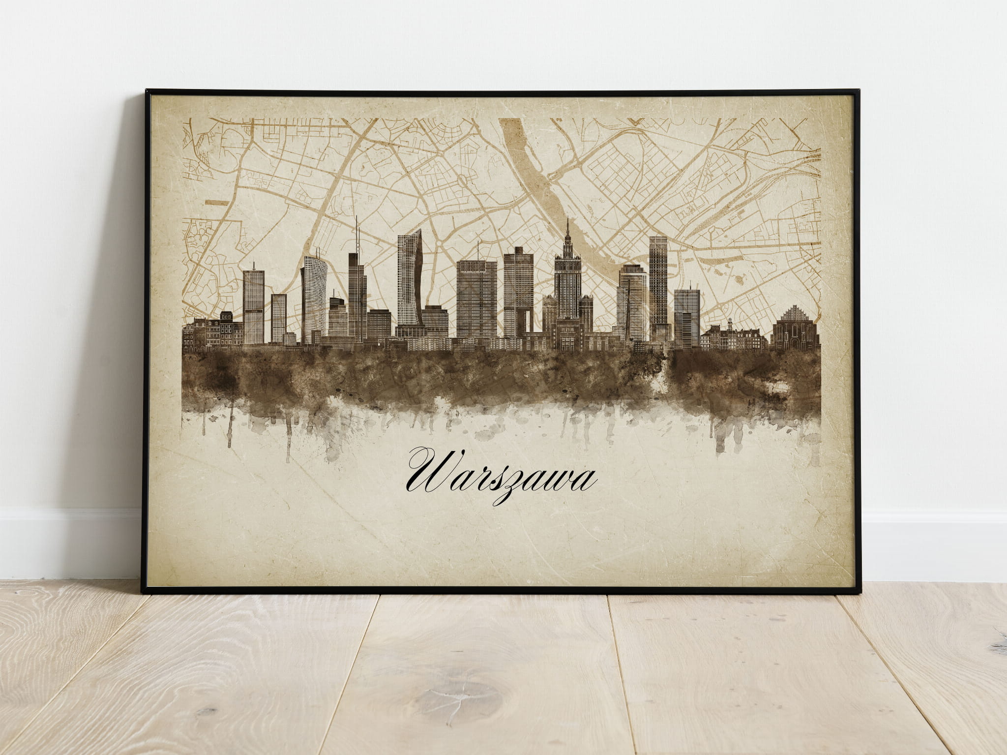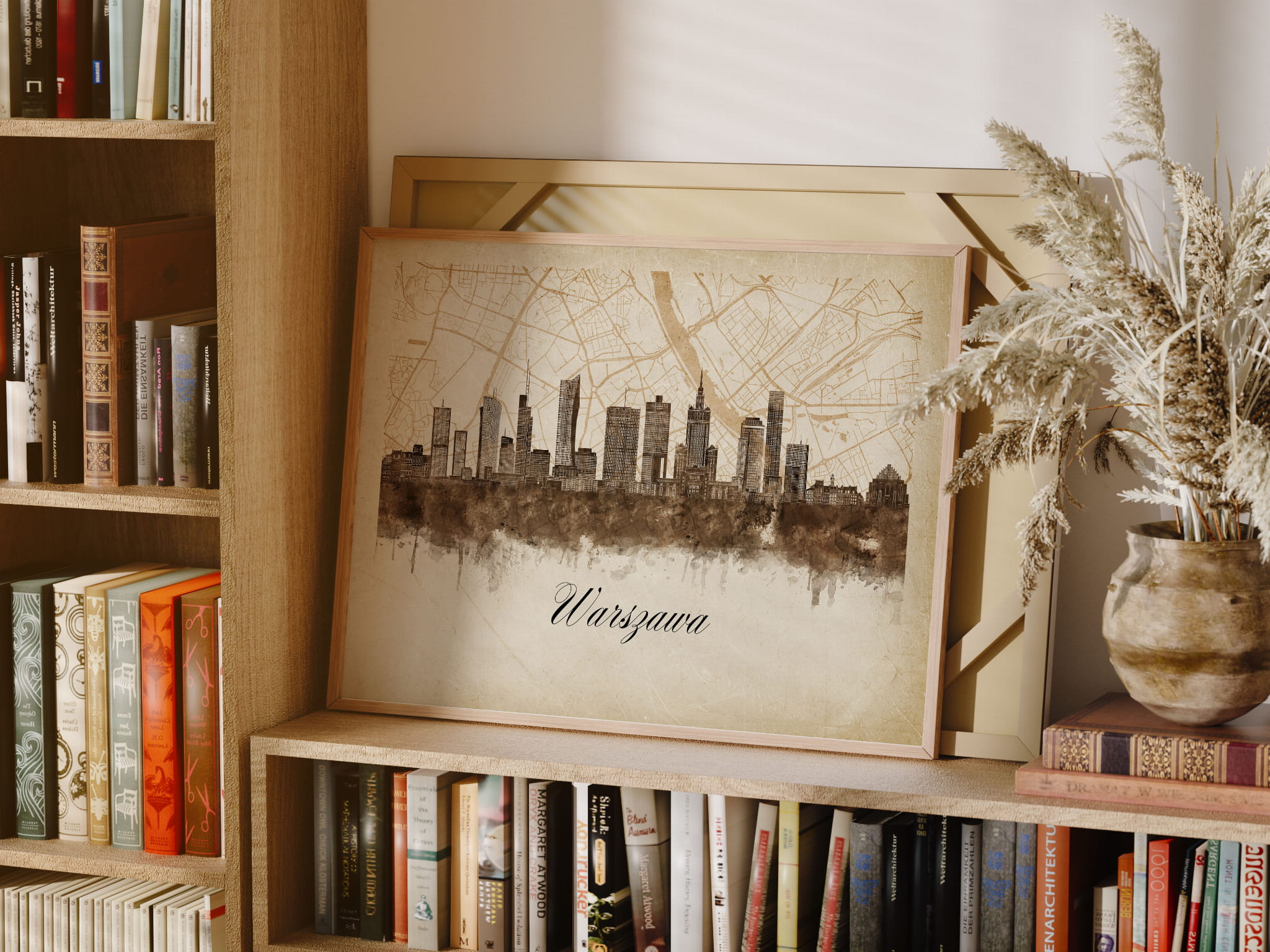 Plakaty skyline w stylu vintage to nowoczesne dzieła sztuki, które nawiązują do estetyki minionych dekad. Przedstawiają miejskie krajobrazy w retro kolorystyce, z wyblakłymi barwami i z delikatną patyną czasu. Kontury są często zmiękczone, a szczegóły budynków lekko stylizowane, co dodaje im nostalgicznego uroku. Tła plakatów utrzymane są w odcieniach przypominających stary papier, z subtelnymi teksturami i ciepłymi, przygaszonymi tonami. Całość tworzy elegancki i przytulny klimat, idealny do wnętrz, które łączą nowoczesność z klasycznym wdziękiem.