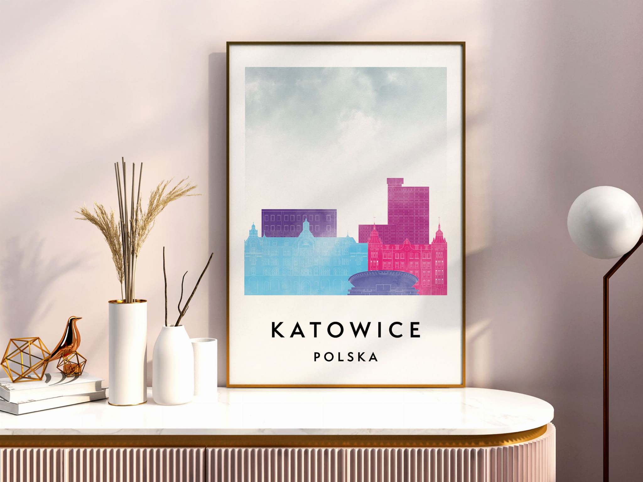 Plakat do salonu skylines Katowice w stylu Watercolor/ Akwarelowym