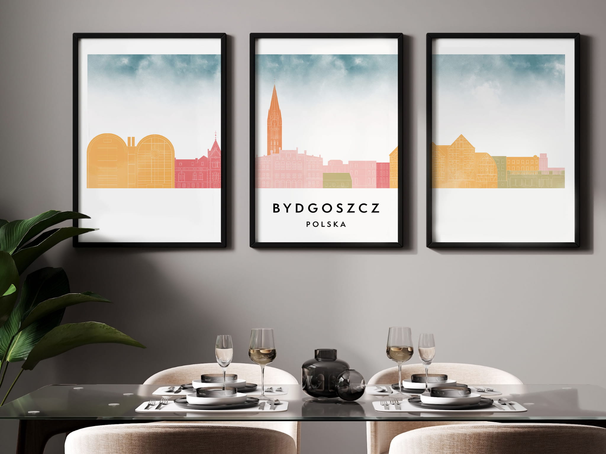 Plakat skylines TRYPTYK Bydgoszcz w stylu Watercolor/ Akwarelowym