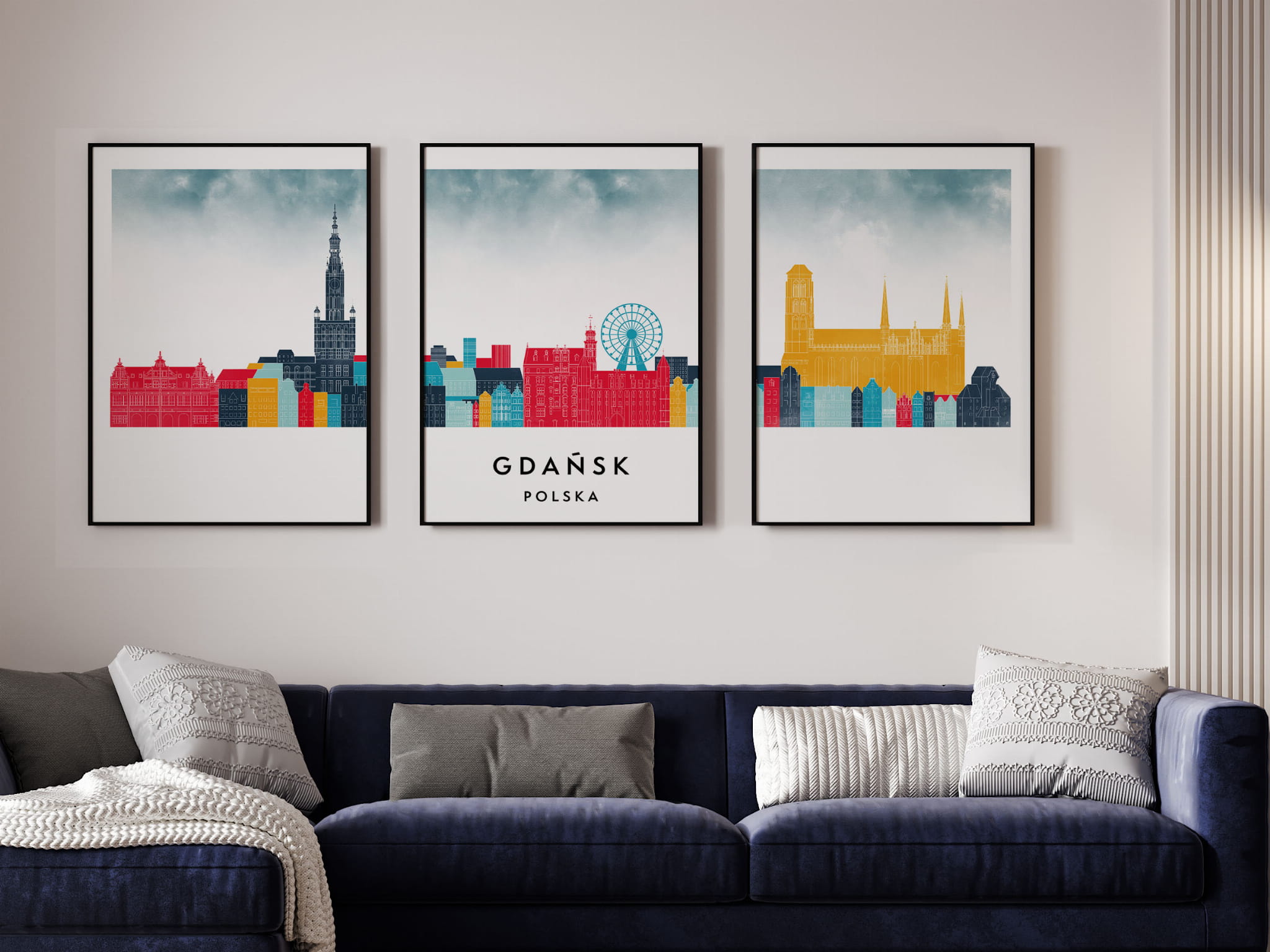 Projektując plakaty z tej serii, postawiliśmy na kolory i charakterystyczne symbole miast.  Taki zestaw podróżniczych plakatów będzie doskonałym uzupełnieniem pomieszczenia.