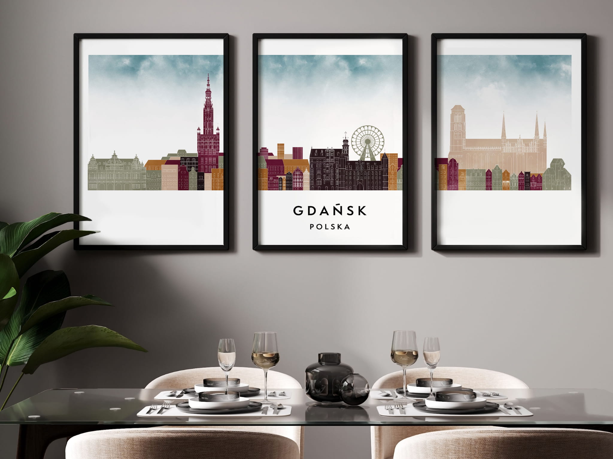Plakat skylines TRYPTYK Gdańsk w stylu Watercolor/ Akwarelowym