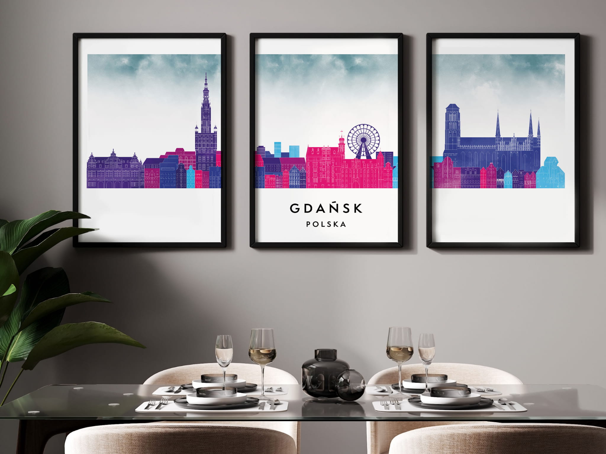 Plakat skylines TRYPTYK Gdańsk w stylu Watercolor/ Akwarelowym