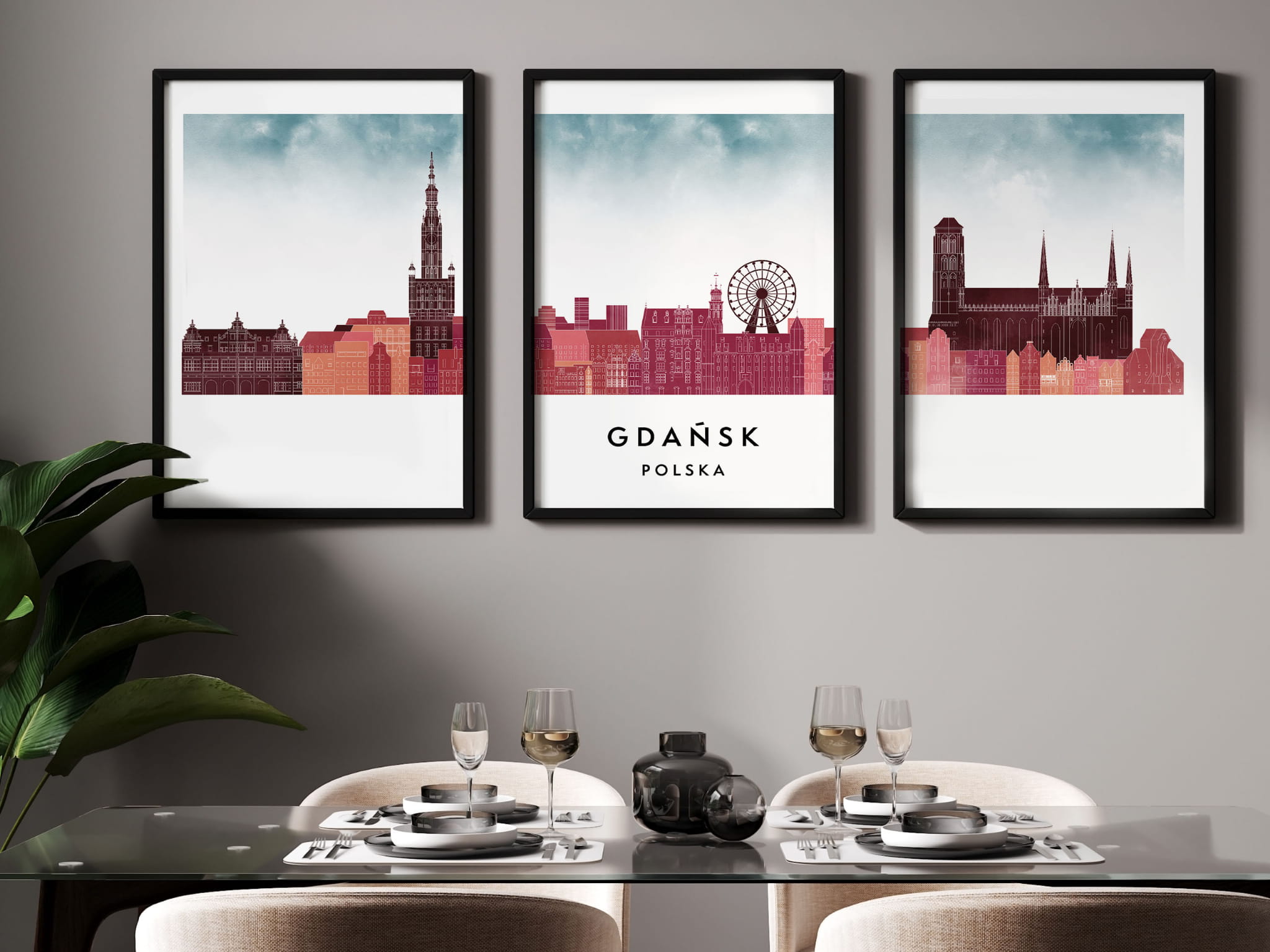 Plakat skylines TRYPTYK Gdańsk w stylu Watercolor/ Akwarelowym