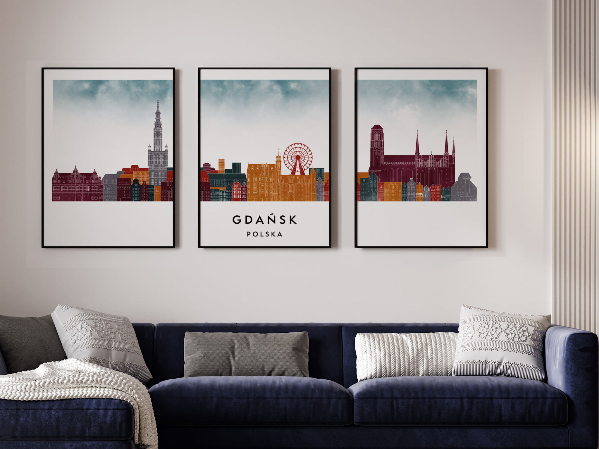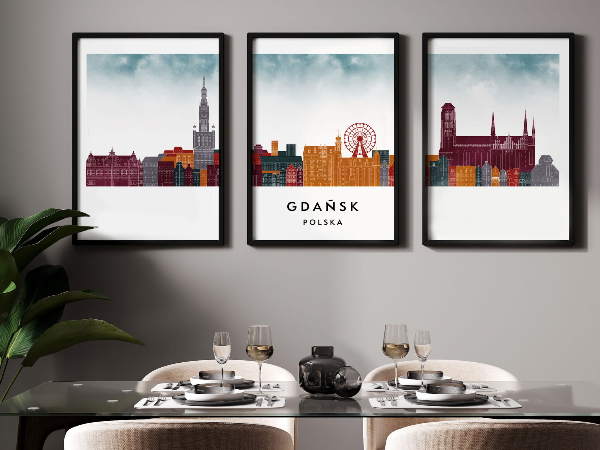 Plakat skylines TRYPTYK Gdańsk w stylu Watercolor/ Akwarelowym