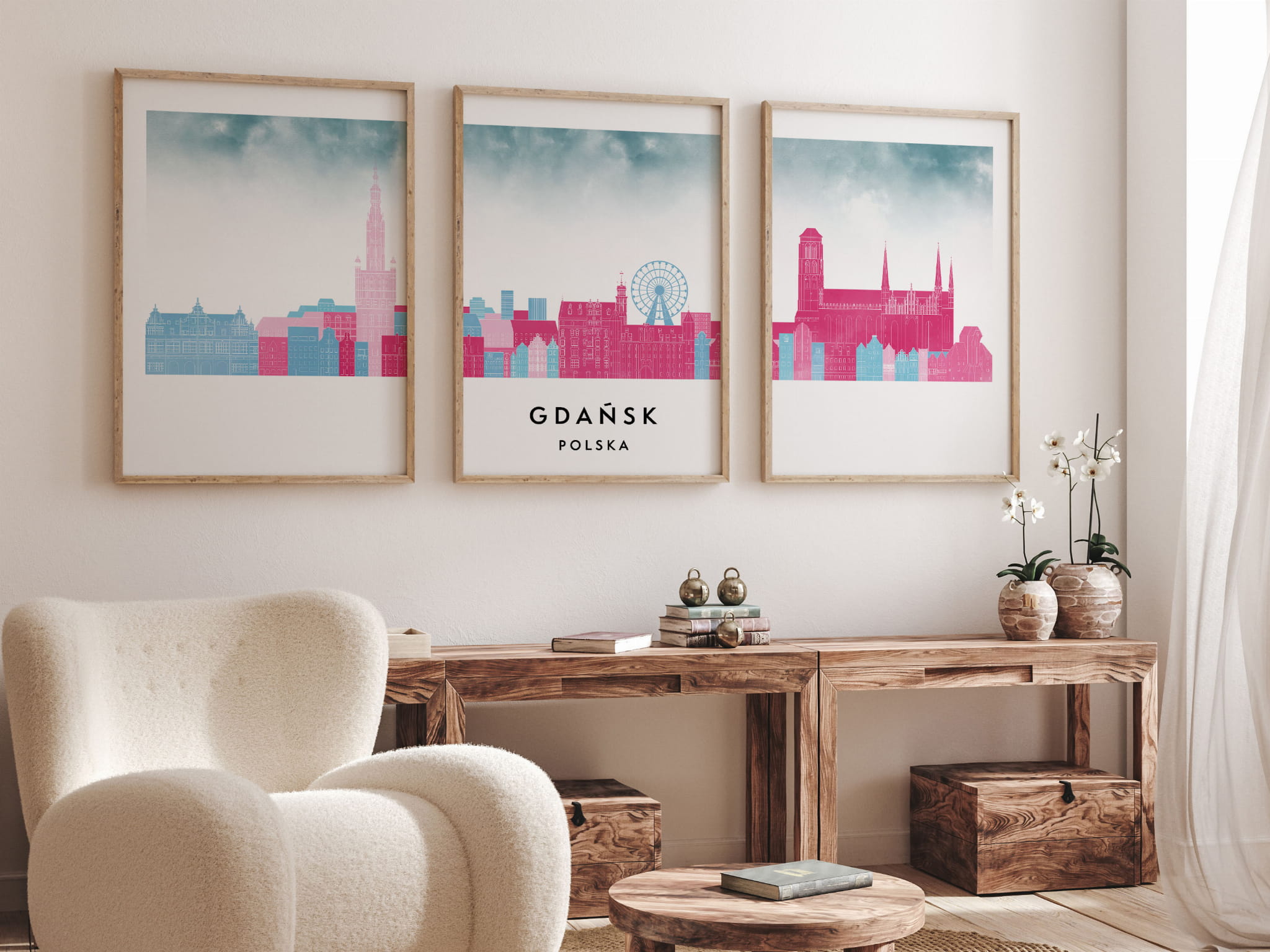 Plakat skylines TRYPTYK Gdańsk w stylu Watercolor/ Akwarelowym
