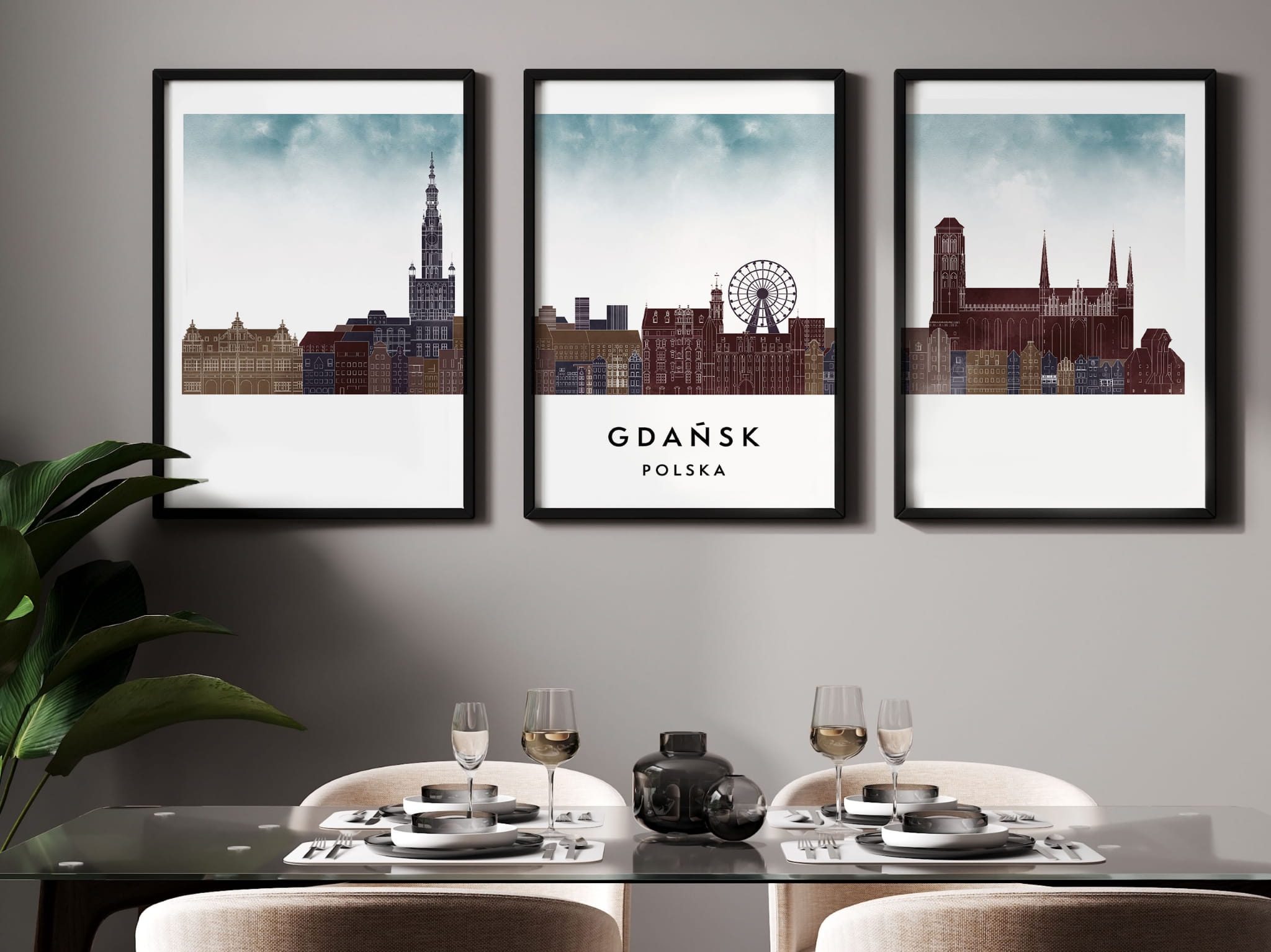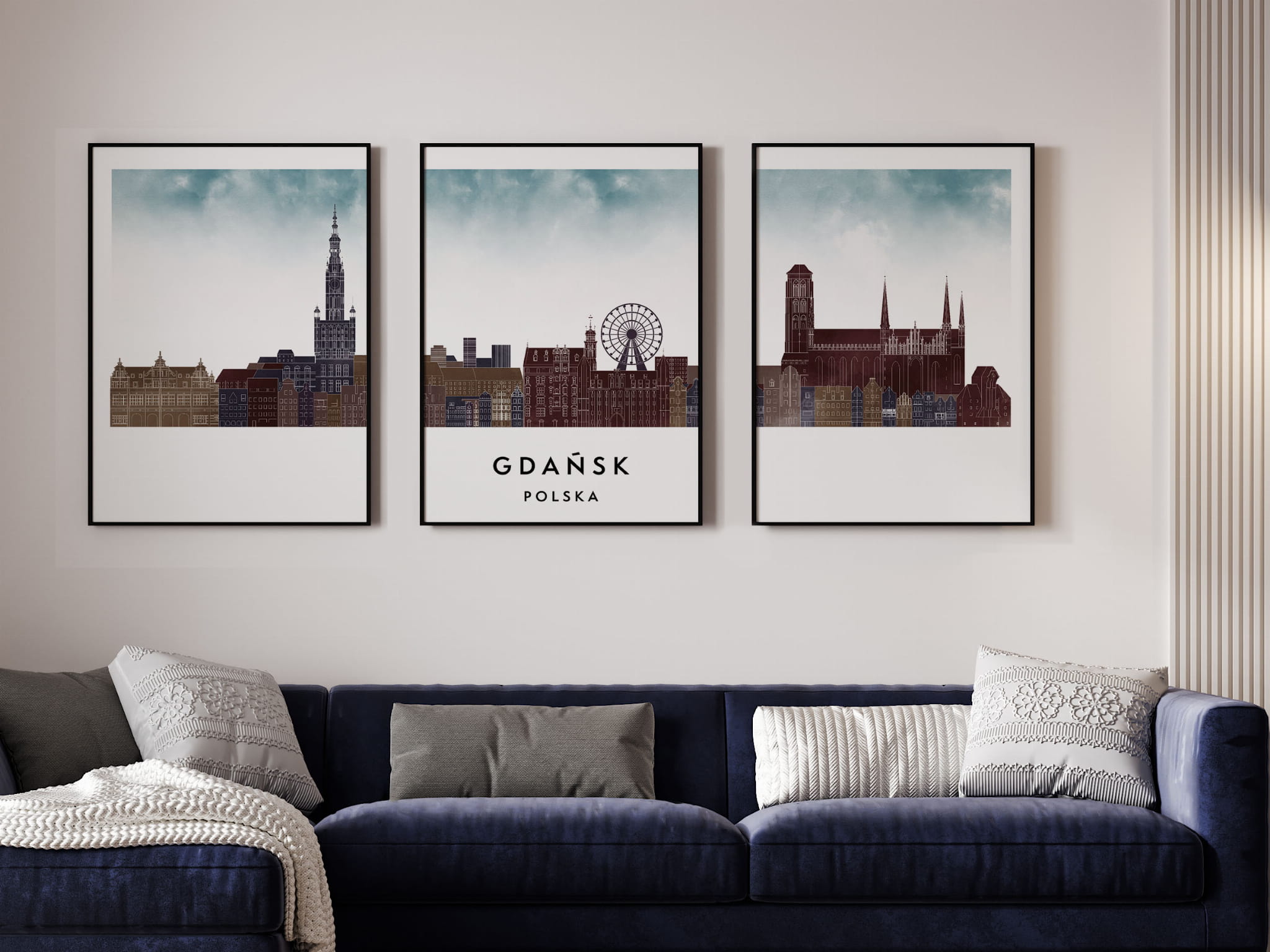 Plakat skylines TRYPTYK Gdańsk w stylu Watercolor/ Akwarelowym