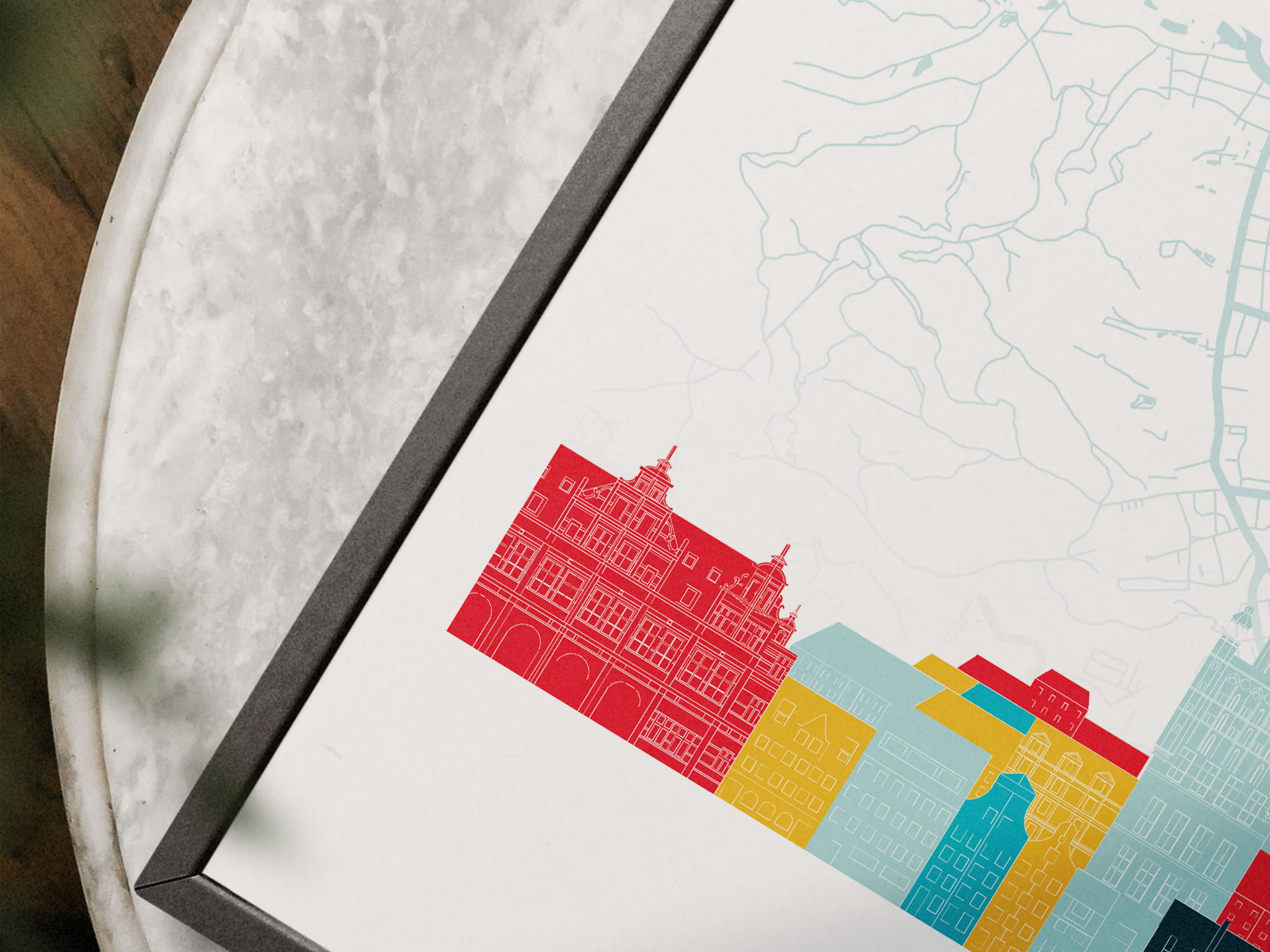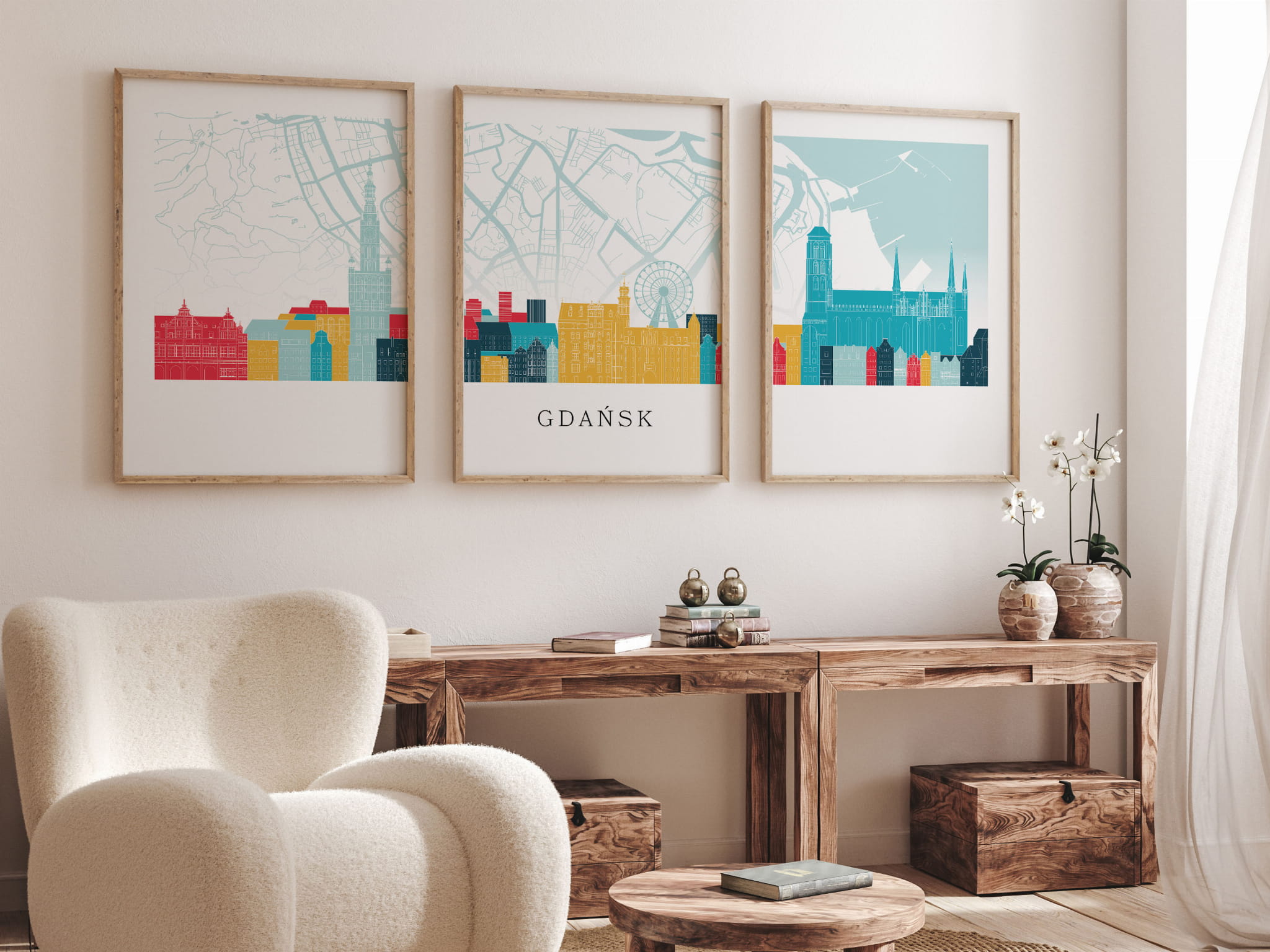 Projektując plakaty z tej serii, postawiliśmy na kolory i charakterystyczne symbole miast.  Taki zestaw podróżniczych plakatów będzie doskonałym uzupełnieniem pomieszczenia.