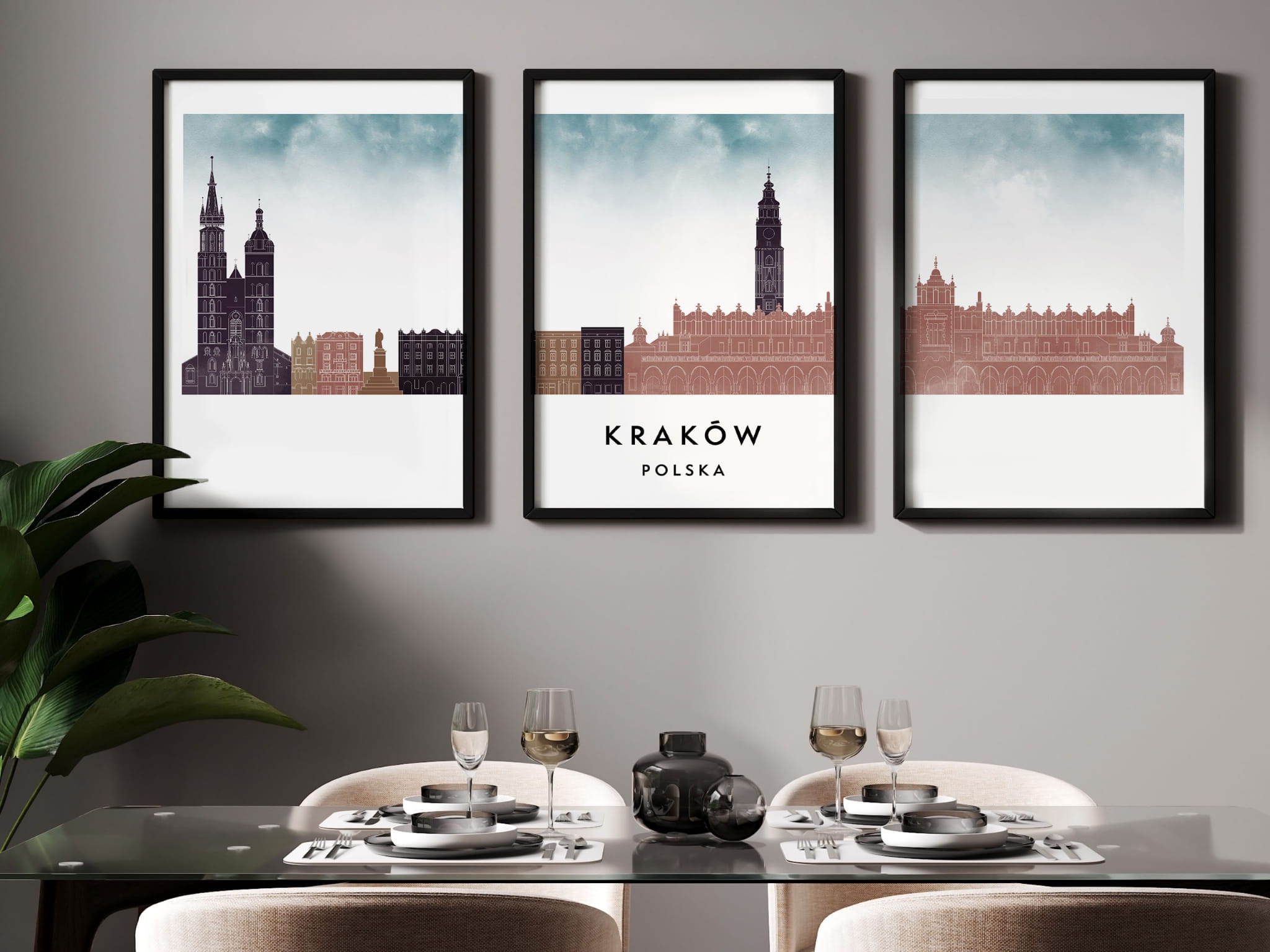 Plakat skylines TRYPTYK Kraków, zestaw 3 plakatów w stylu Watercolor/ Akwarelowym