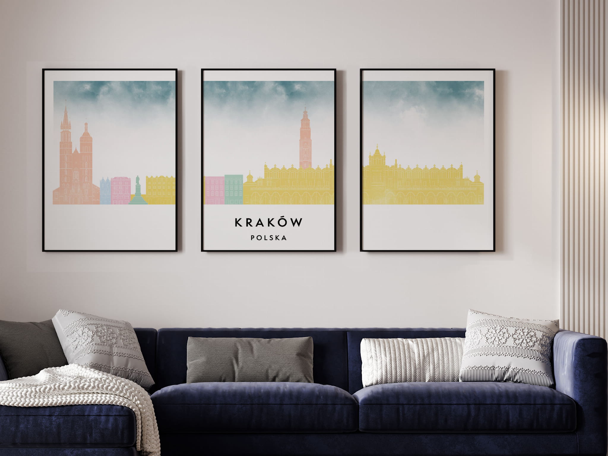 Plakat skylines TRYPTYK Kraków, zestaw 3 plakatów w stylu Watercolor/ Akwarelowym