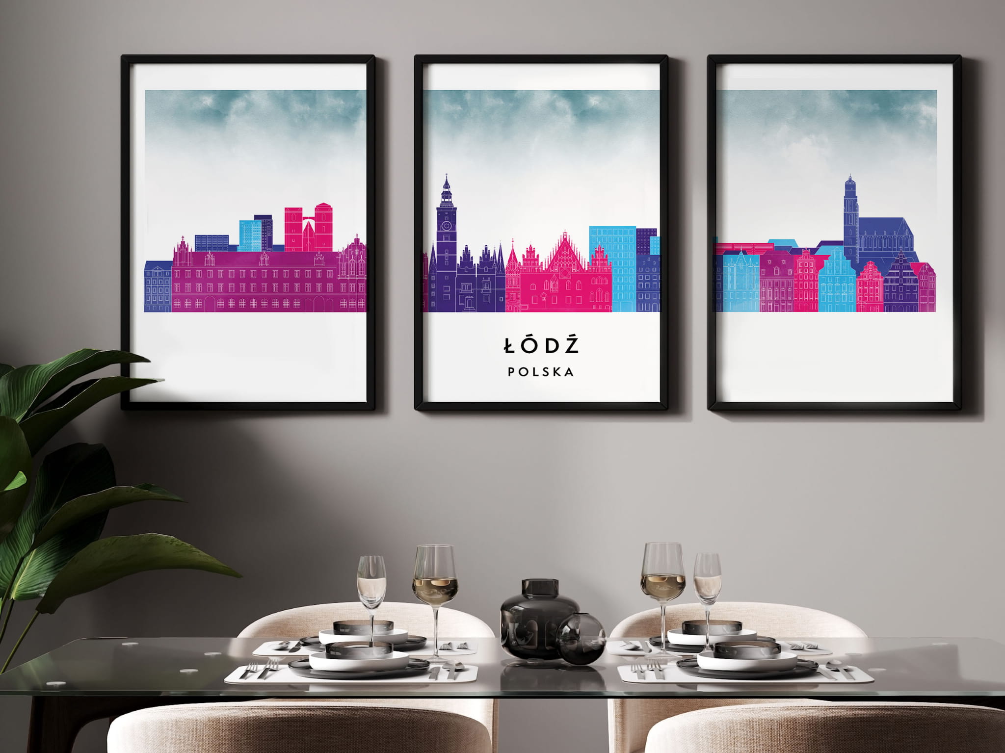 Plakat skylines TRYPTYK Łódź , zestaw 3 plakatów w stylu Watercolor/ Akwarelowym
