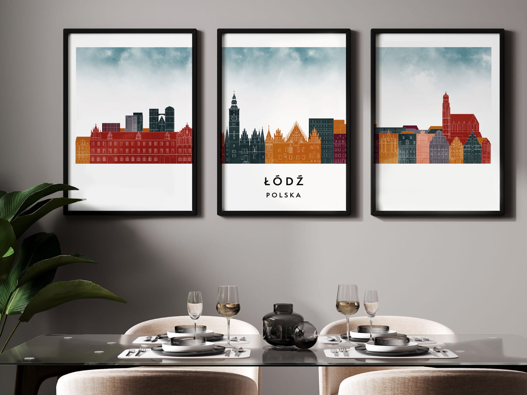 Plakat skylines TRYPTYK Łódź , zestaw 3 plakatów w stylu Watercolor/ Akwarelowym
