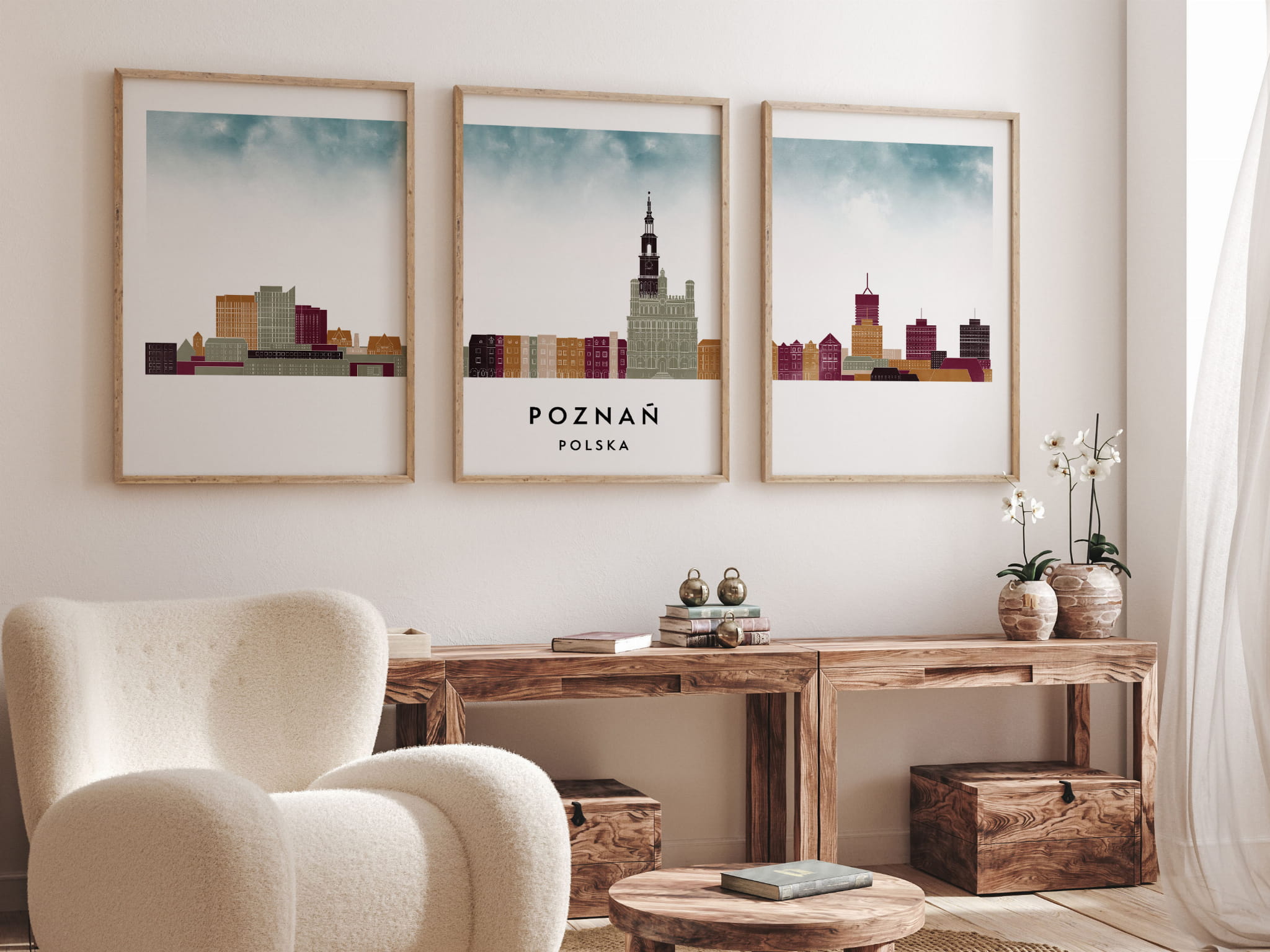 Plakat skylines TRYPTYK Poznań , zestaw 3 plakatów w stylu Watercolor/ Akwarelowym