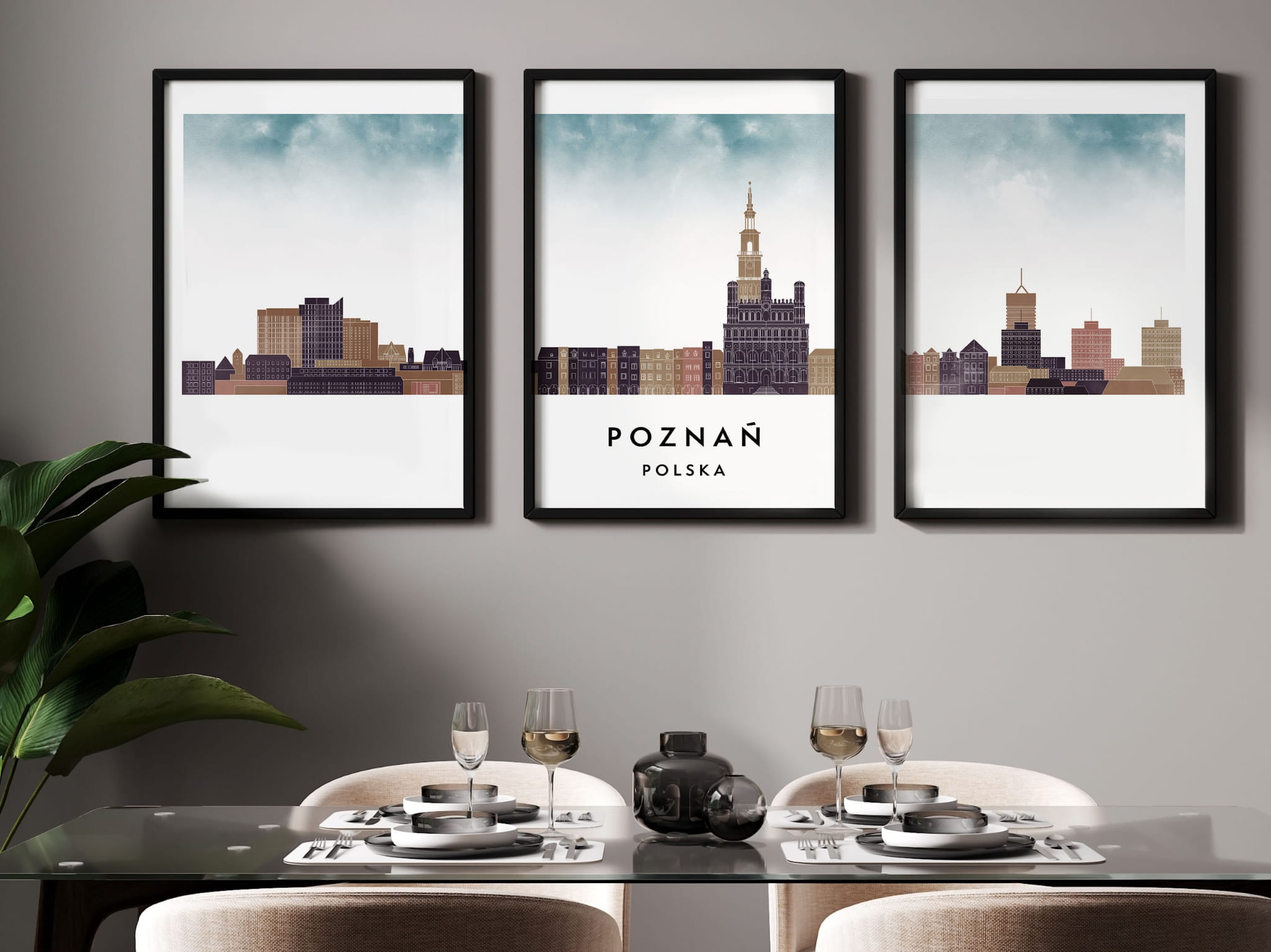 Plakat skylines TRYPTYK Poznań , zestaw 3 plakatów w stylu Watercolor/ Akwarelowym