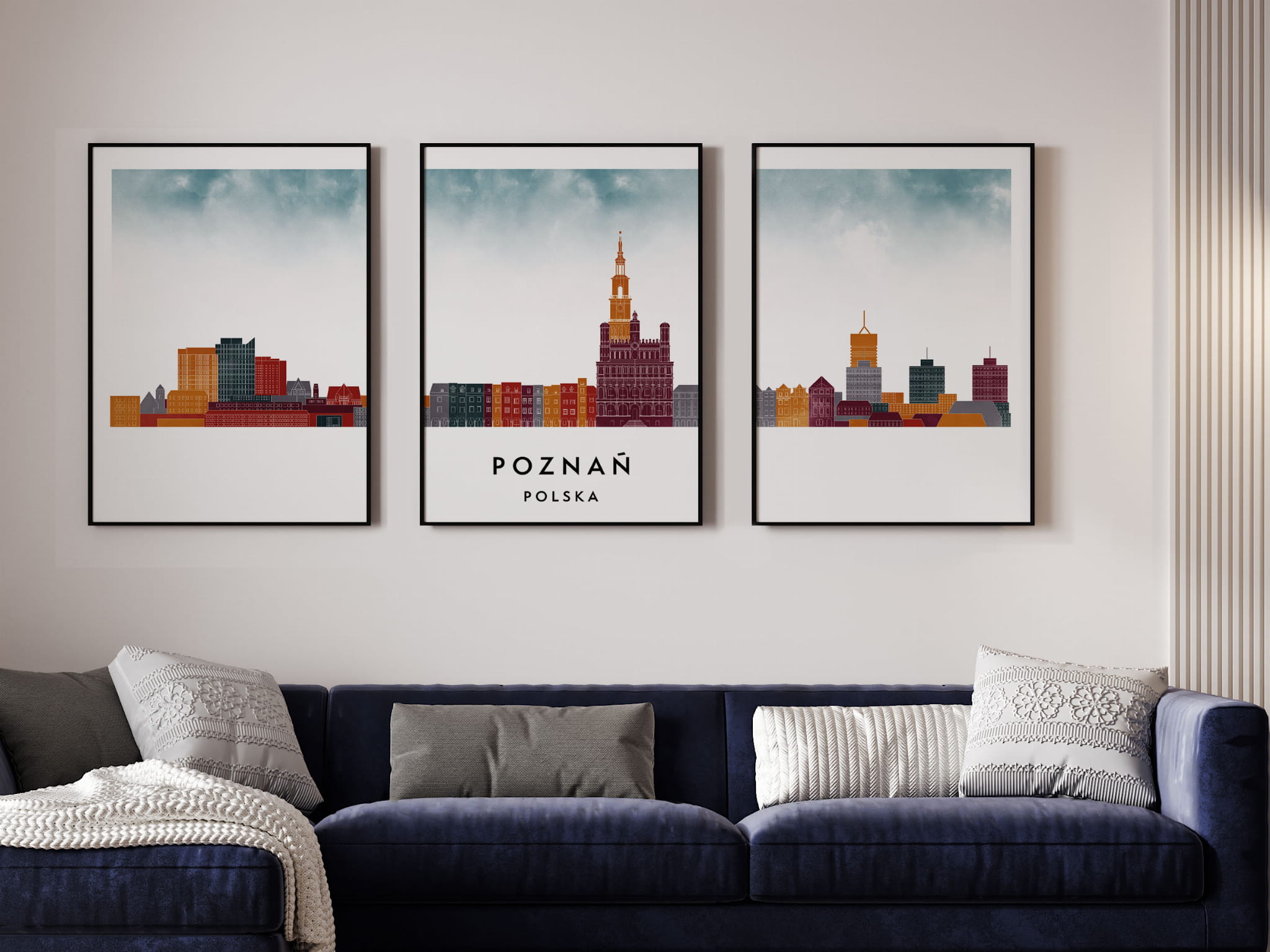 Plakat skylines TRYPTYK Poznań , zestaw 3 plakatów w stylu Watercolor/ Akwarelowym