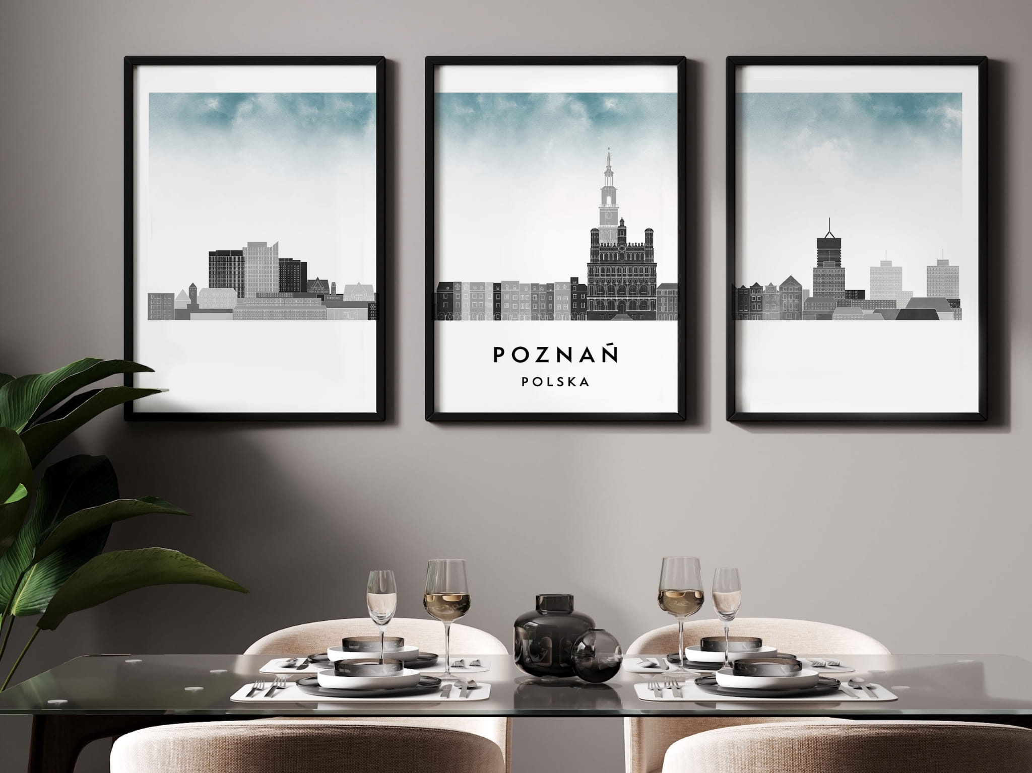 Plakat skylines TRYPTYK Poznań , zestaw 3 plakatów w stylu Watercolor/ Akwarelowym