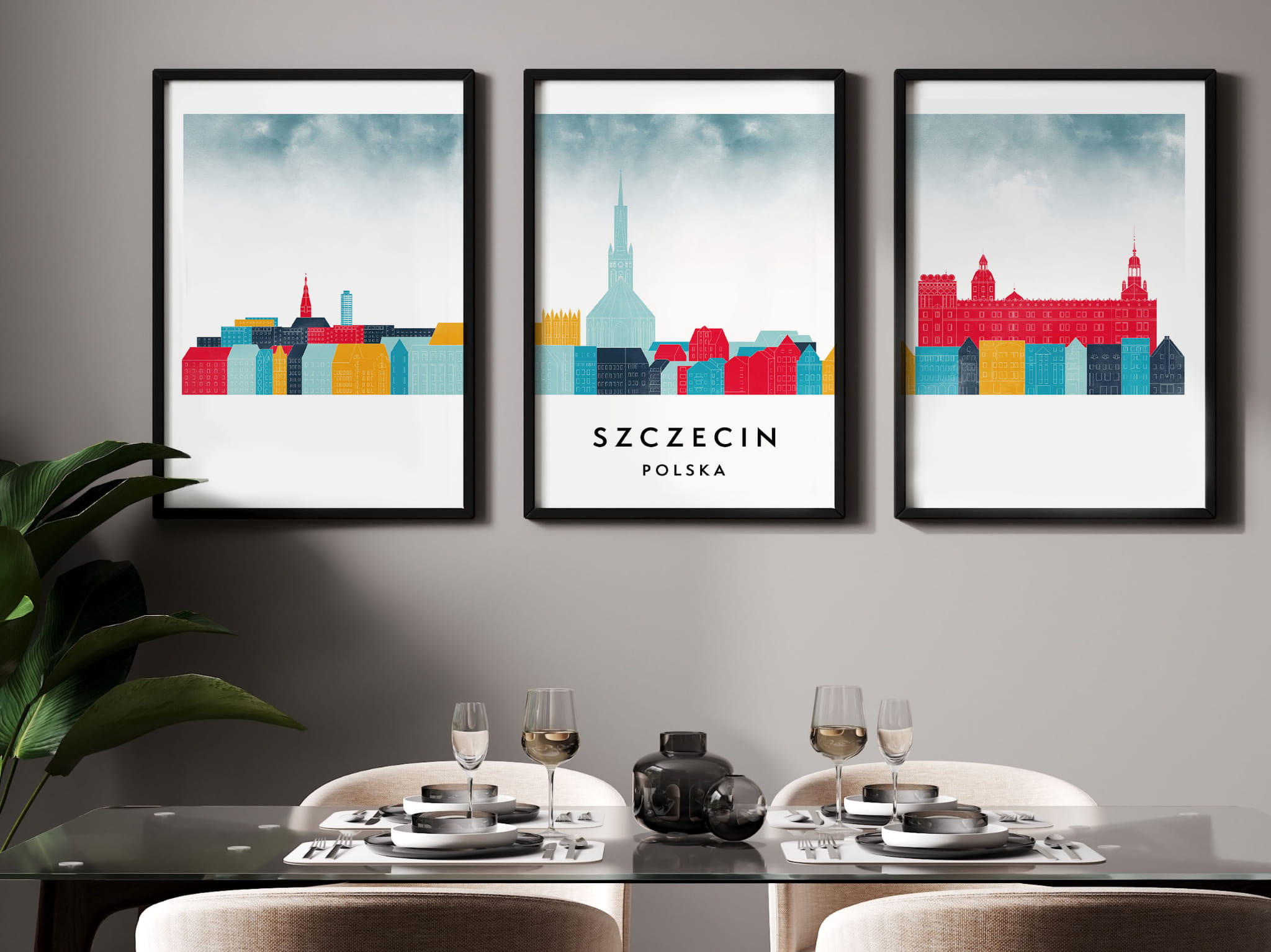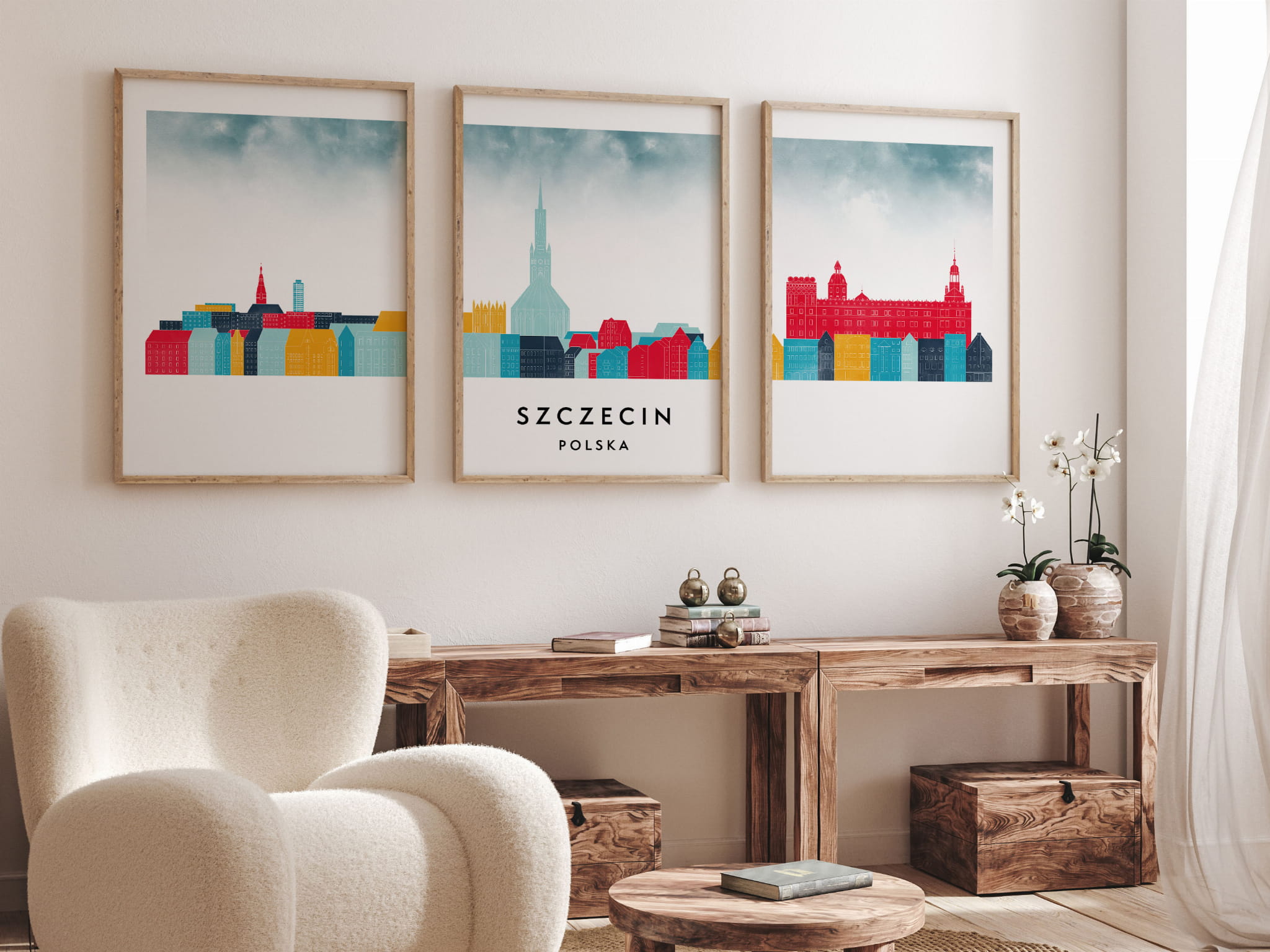 Plakat skylines TRYPTYK Szczecin, zestaw 3 plakatów w stylu Watercolor/ Akwarelowym