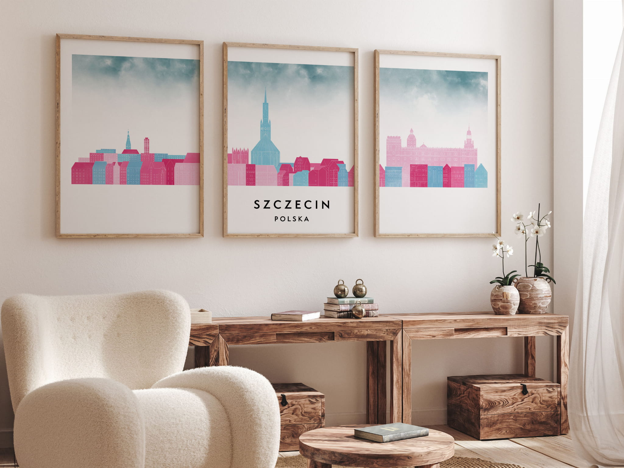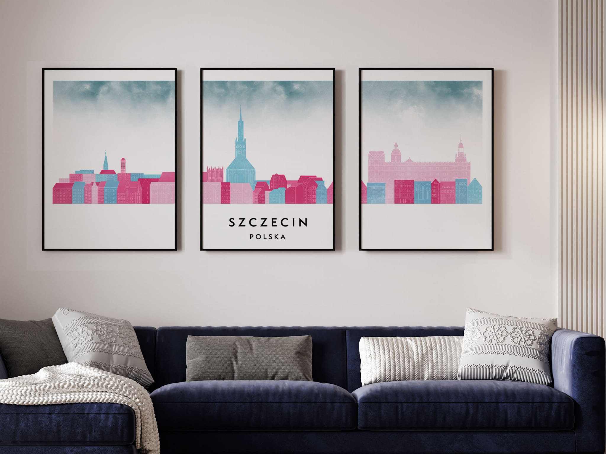 Plakat skylines TRYPTYK Szczecin, zestaw 3 plakatów w stylu Watercolor/ Akwarelowym