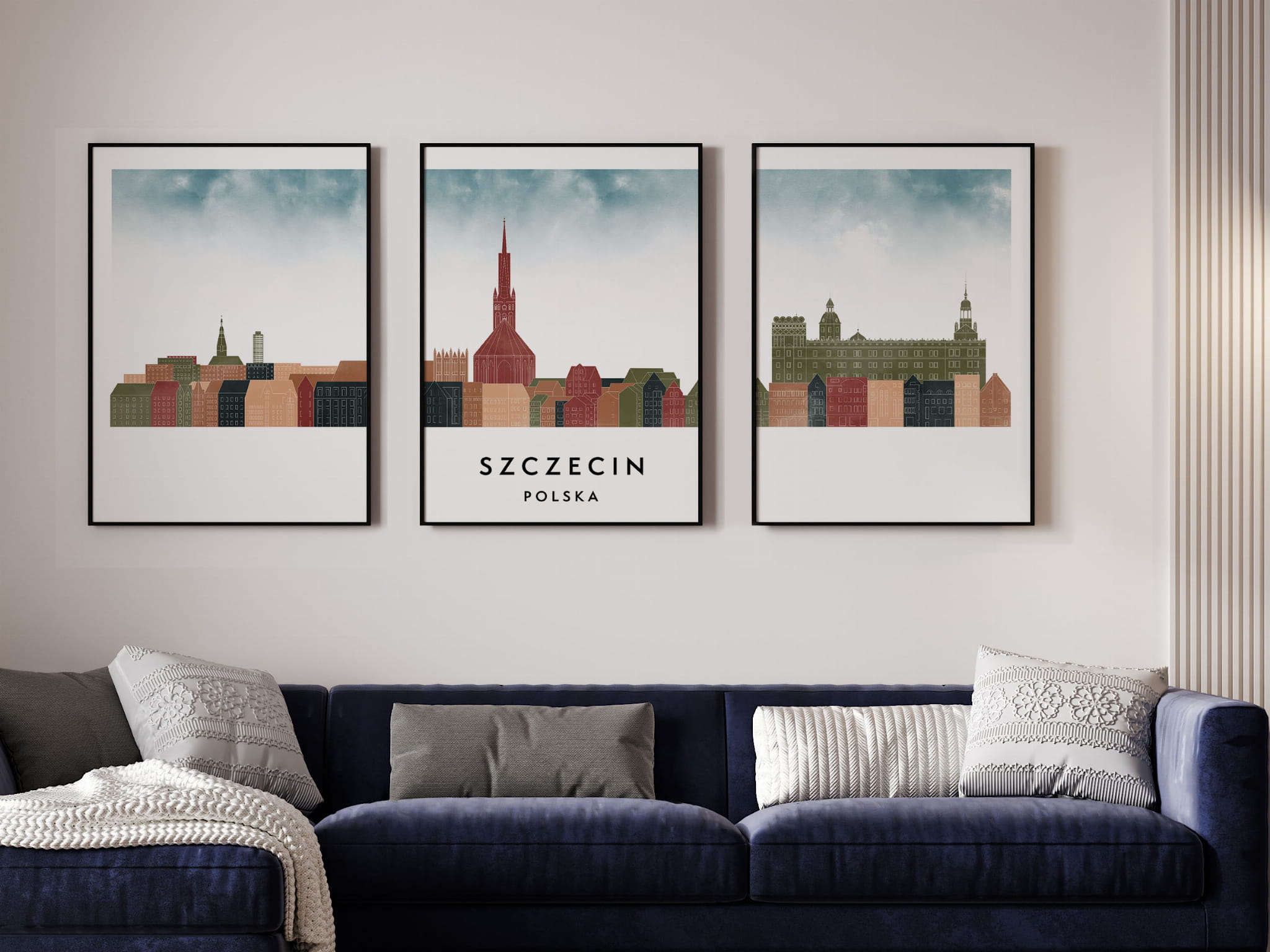 Plakat skylines TRYPTYK Szczecin, zestaw 3 plakatów w stylu Watercolor/ Akwarelowym