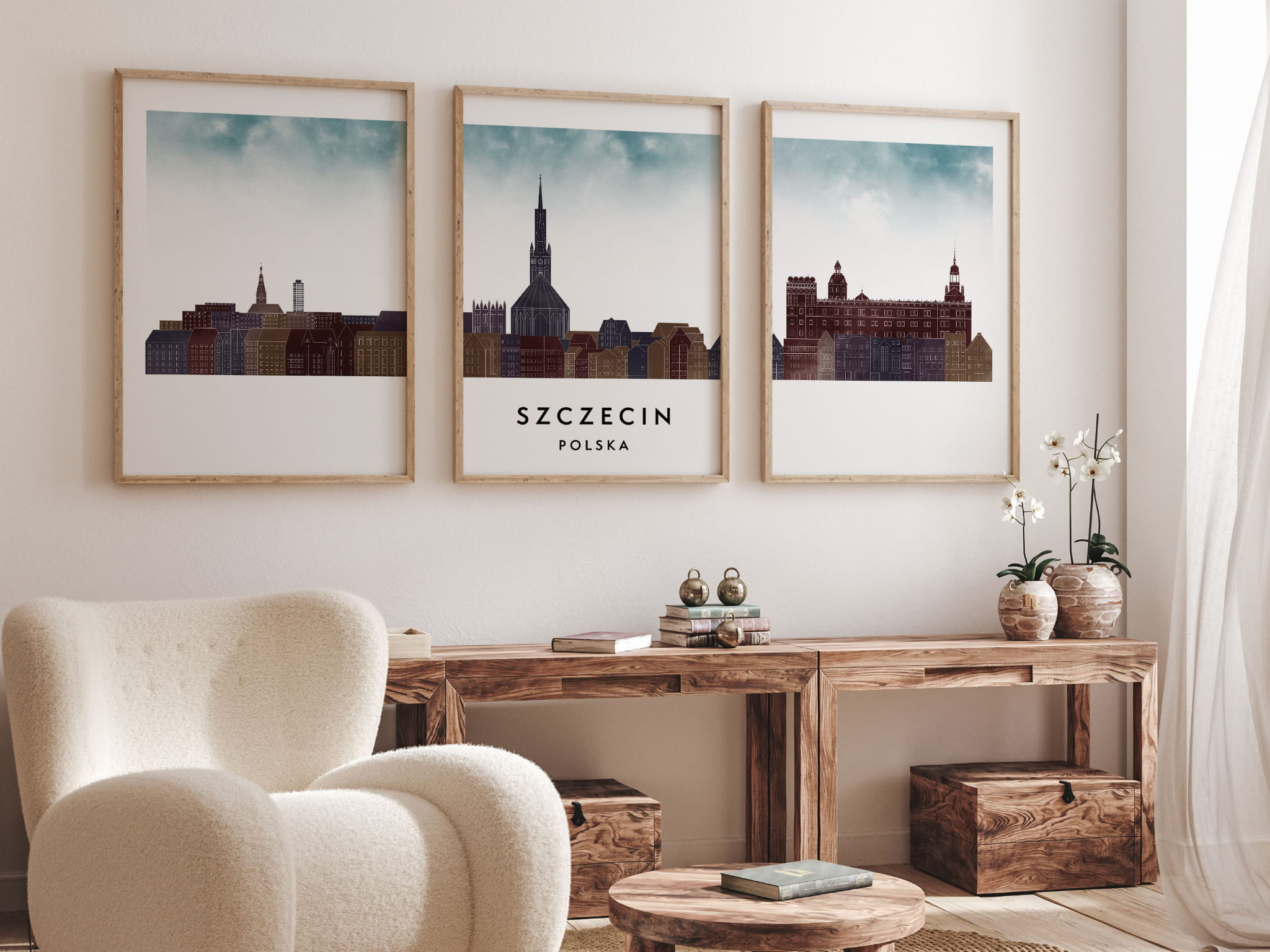 Plakat skylines TRYPTYK Szczecin, zestaw 3 plakatów w stylu Watercolor/ Akwarelowym