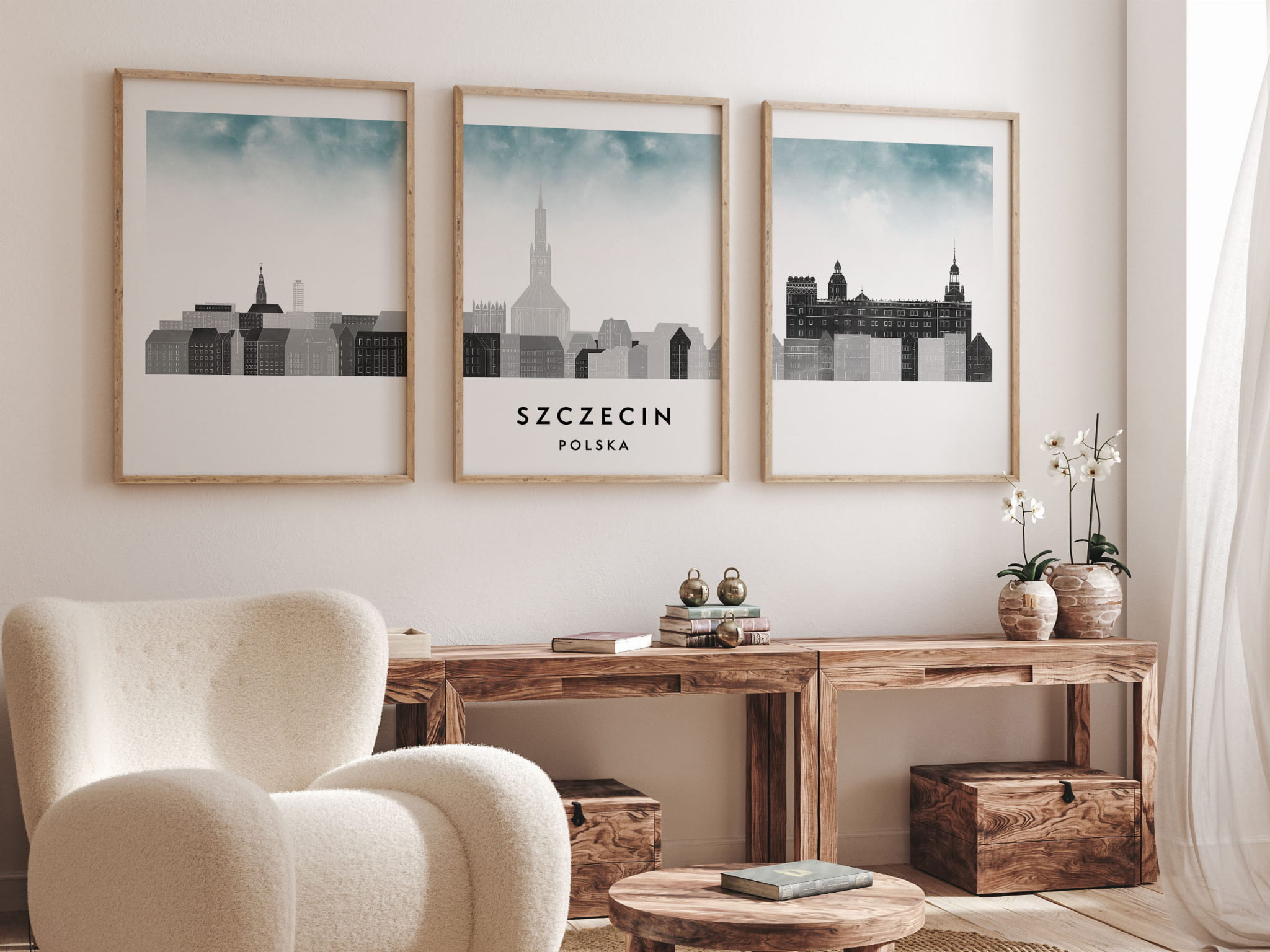Plakat skylines TRYPTYK Szczecin, zestaw 3 plakatów w stylu Watercolor/ Akwarelowym