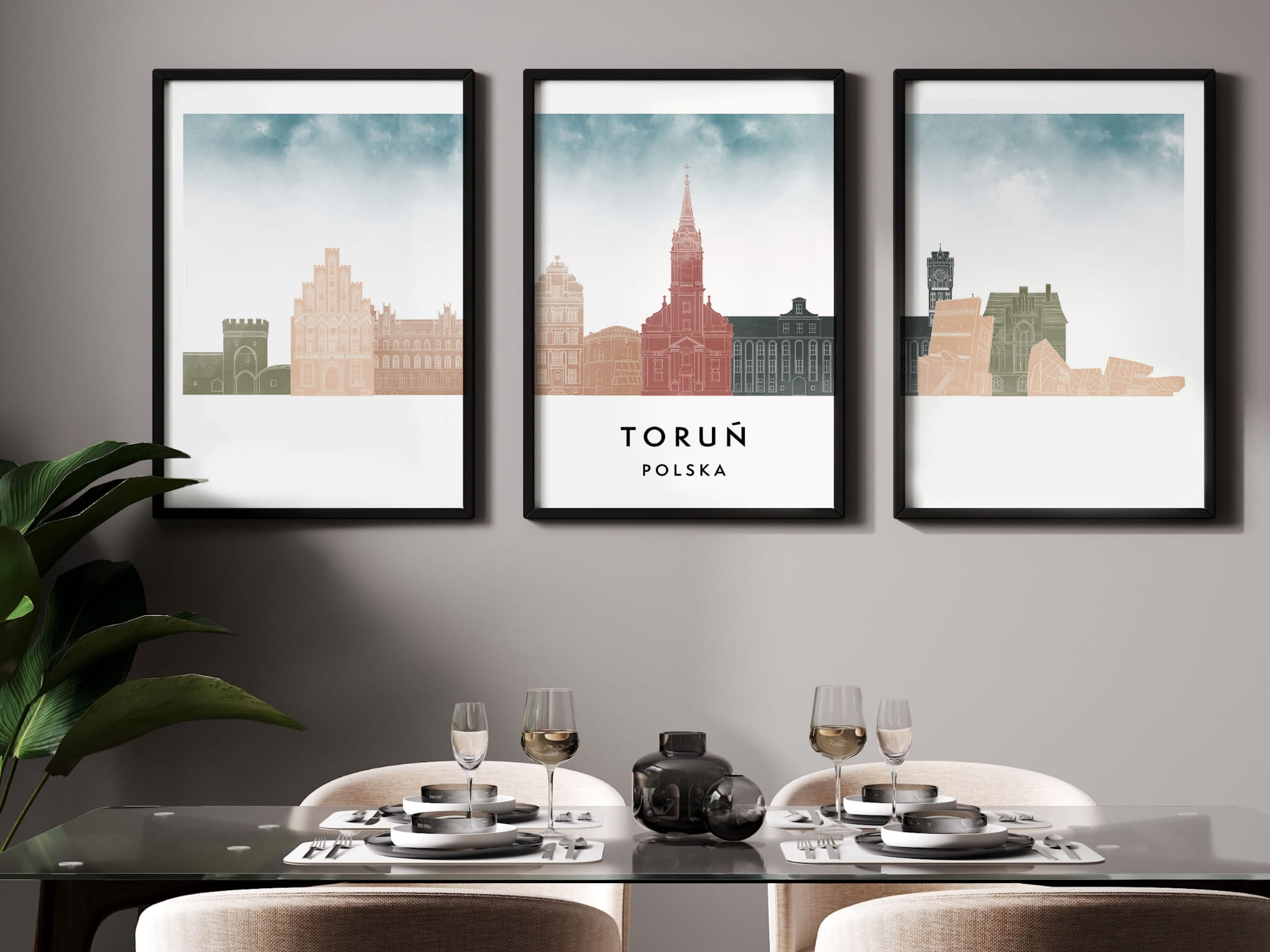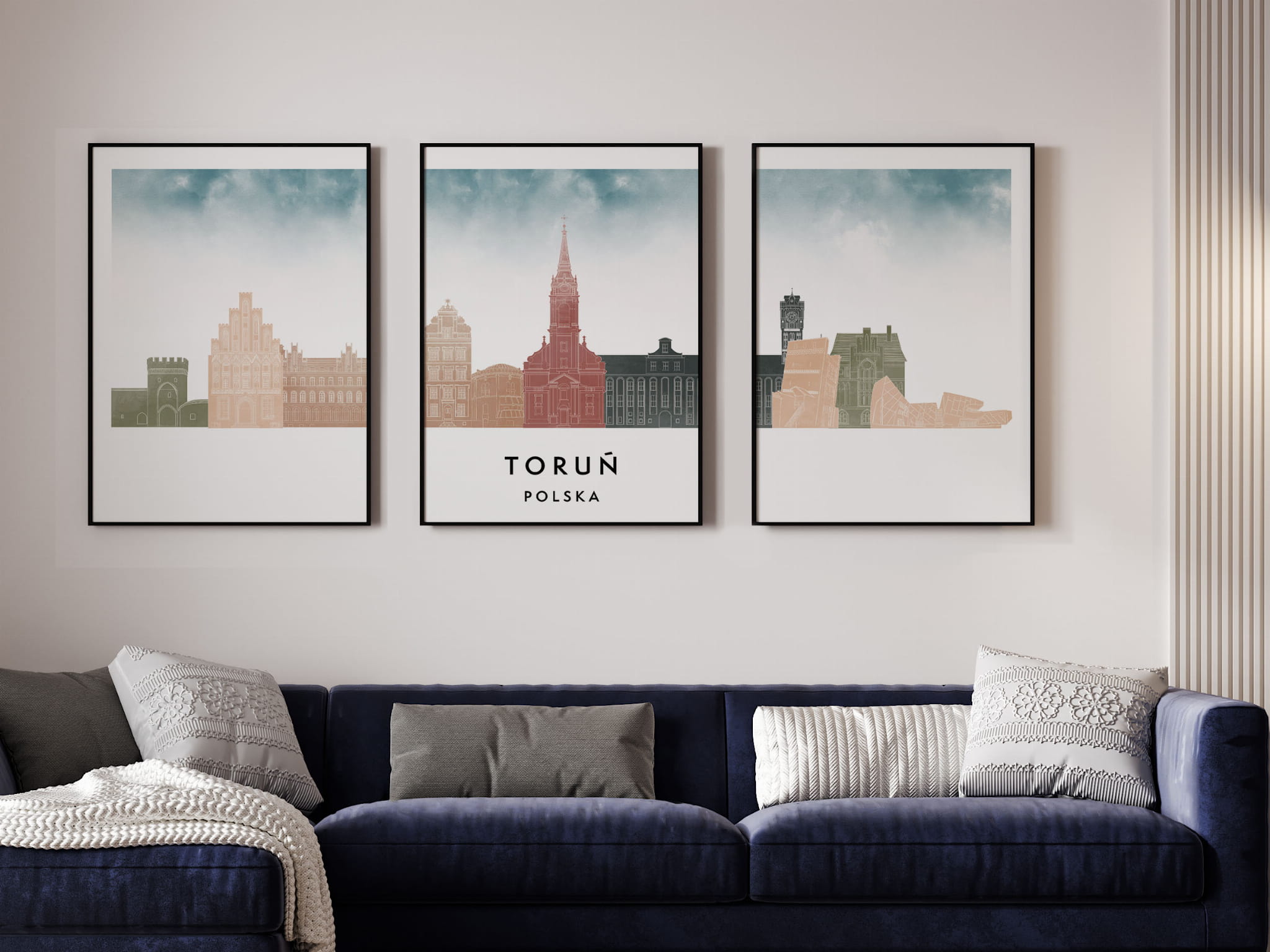Plakat skylines TRYPTYK Toruń, zestaw 3 plakatów w stylu Watercolor/ Akwarelowym