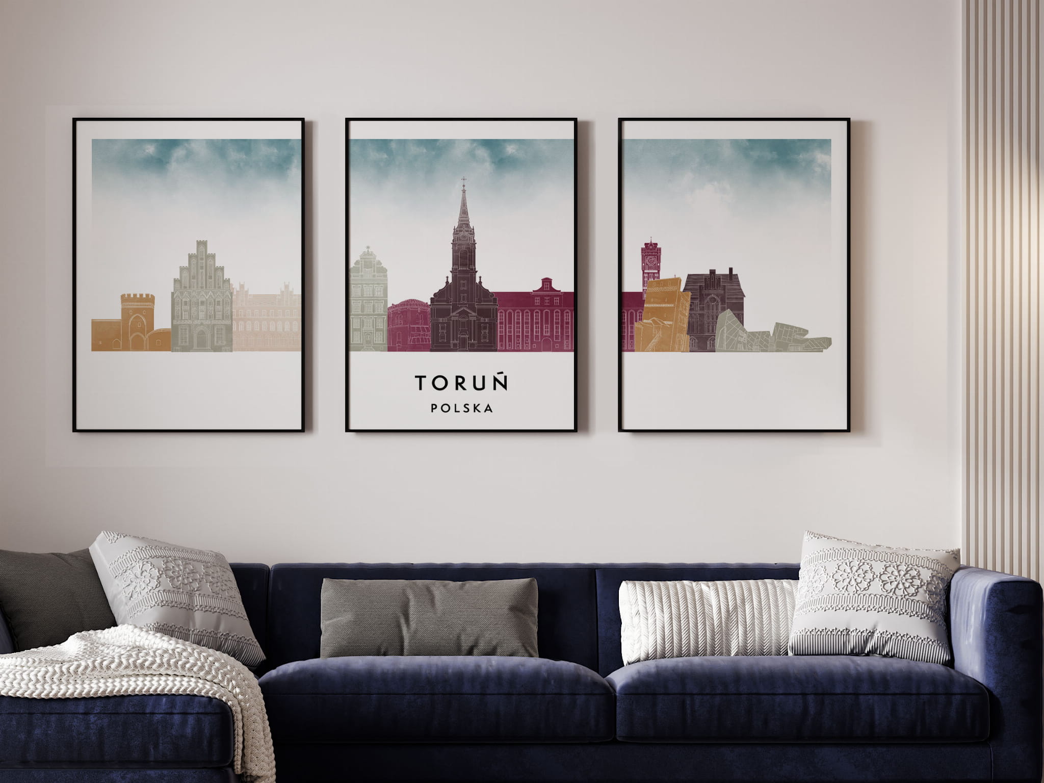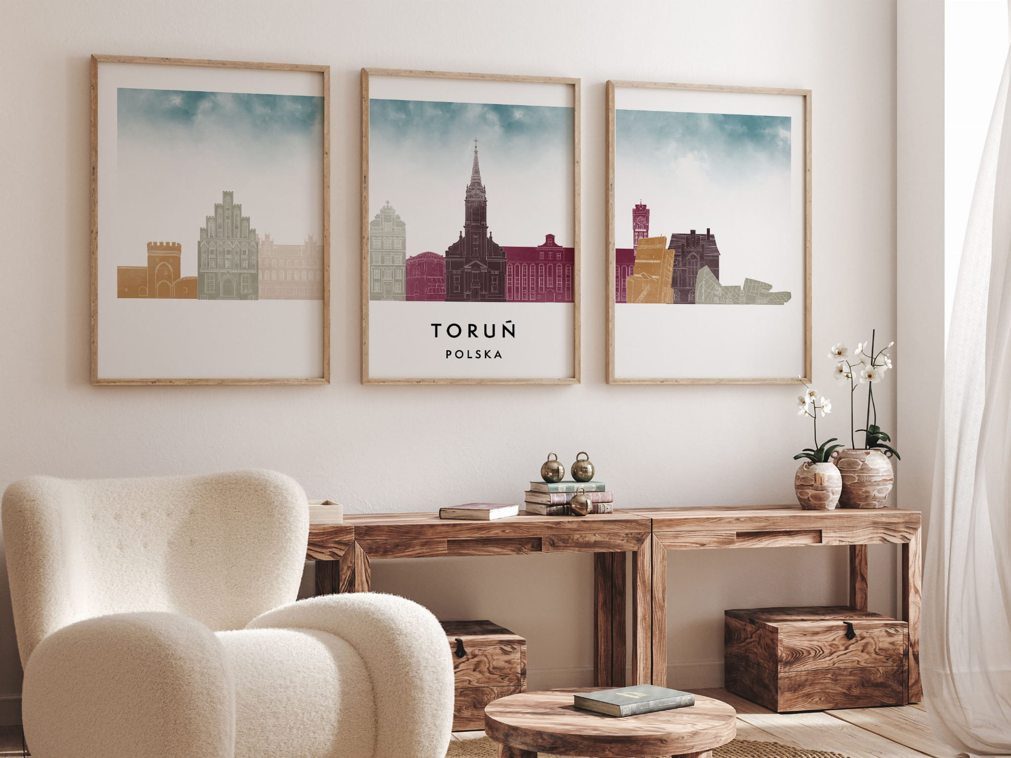 Plakat skylines TRYPTYK Toruń, zestaw 3 plakatów w stylu Watercolor/ Akwarelowym