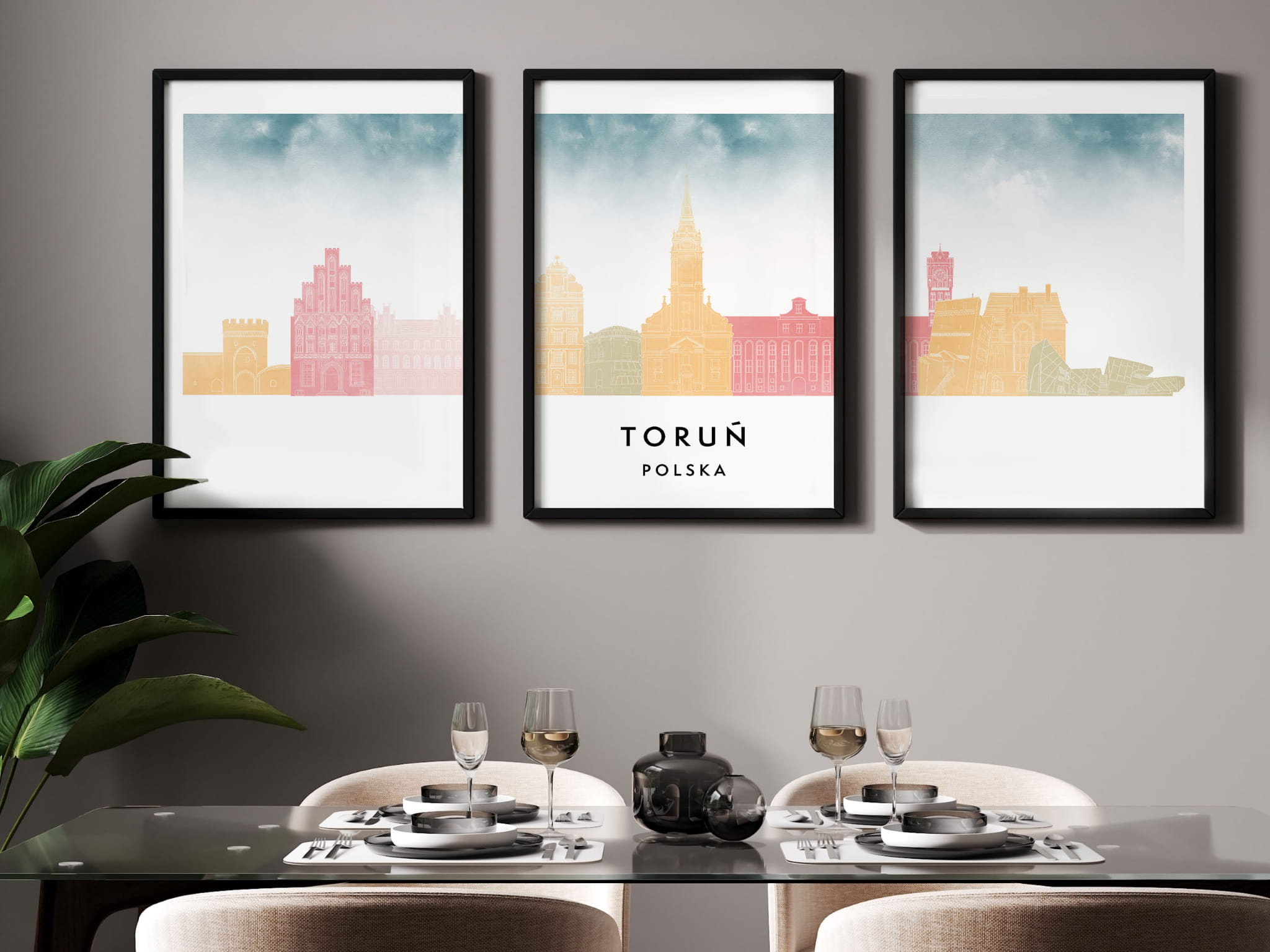 Plakat skylines TRYPTYK Toruń, zestaw 3 plakatów w stylu Watercolor/ Akwarelowym