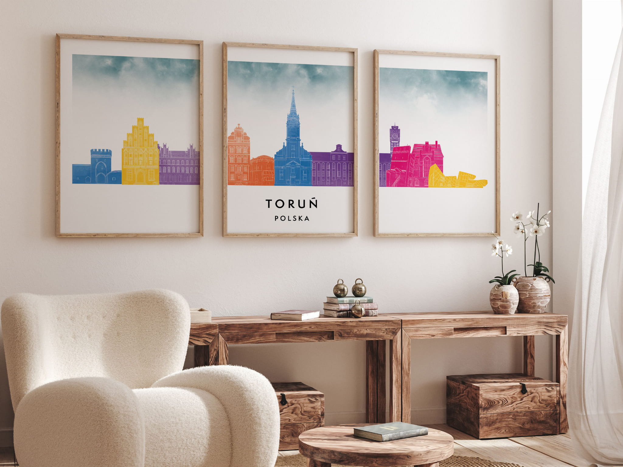 Plakat skylines TRYPTYK Toruń, zestaw 3 plakatów w stylu Watercolor/ Akwarelowym