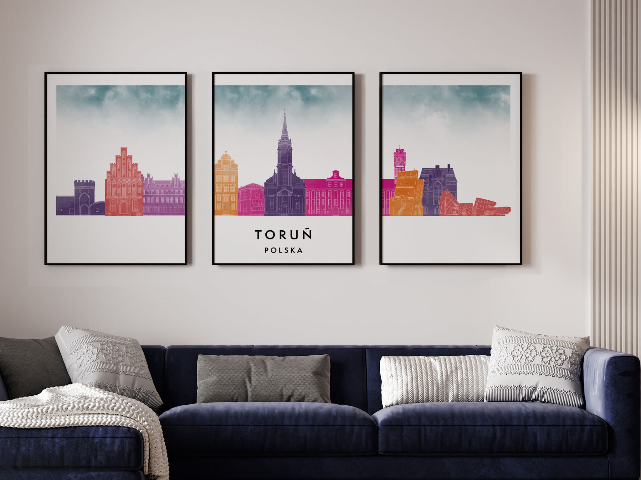 Plakat skylines TRYPTYK Toruń, zestaw 3 plakatów w stylu Watercolor/ Akwarelowym