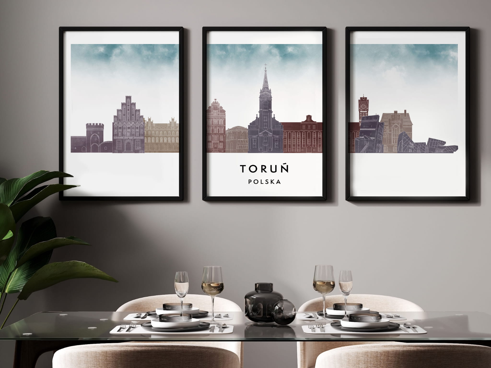Plakat skylines TRYPTYK Toruń, zestaw 3 plakatów w stylu Watercolor/ Akwarelowym