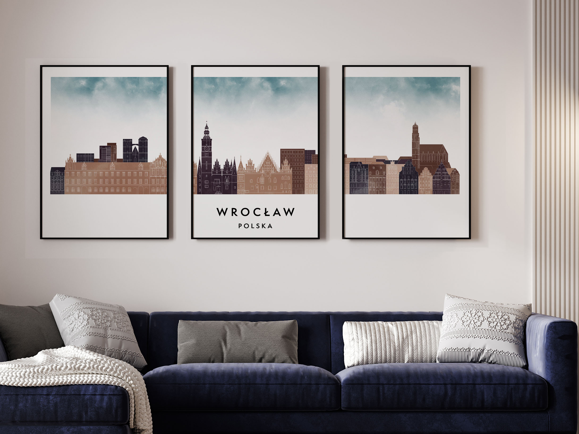 Plakat skylines TRYPTYK Wrocław, zestaw 3 plakatów w stylu Watercolor/ Akwarelowym