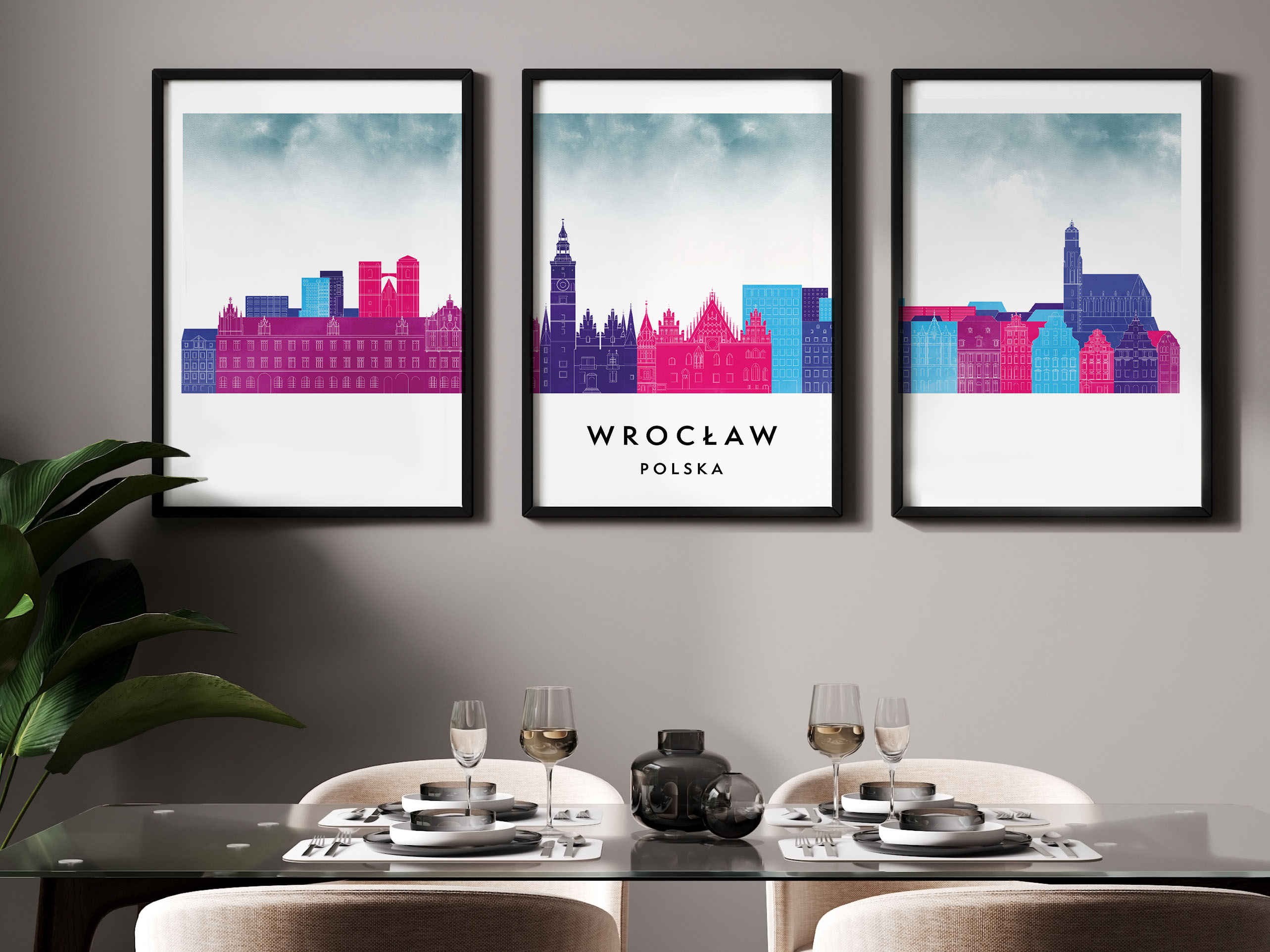 Plakat skylines TRYPTYK Wrocław, zestaw 3 plakatów w stylu Watercolor/ Akwarelowym