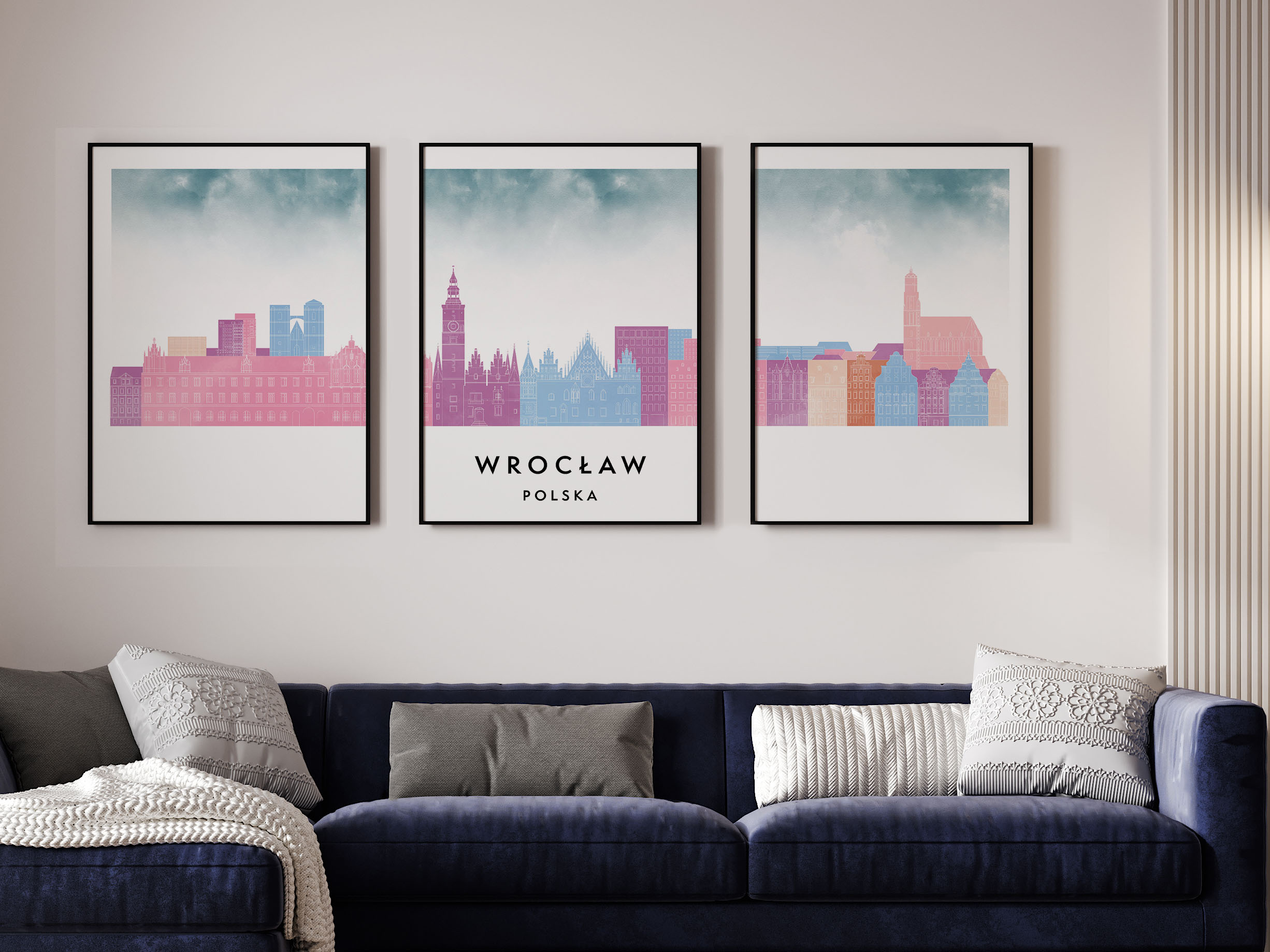 Plakat skylines TRYPTYK Wrocław, zestaw 3 plakatów w stylu Watercolor/ Akwarelowym