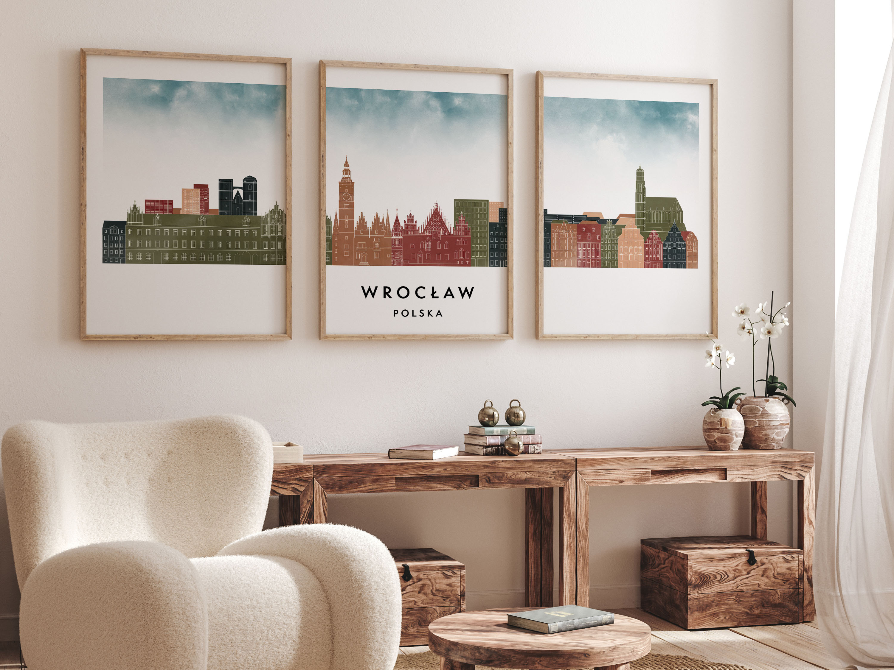 Plakat skylines TRYPTYK Wrocław, zestaw 3 plakatów w stylu Watercolor/ Akwarelowym