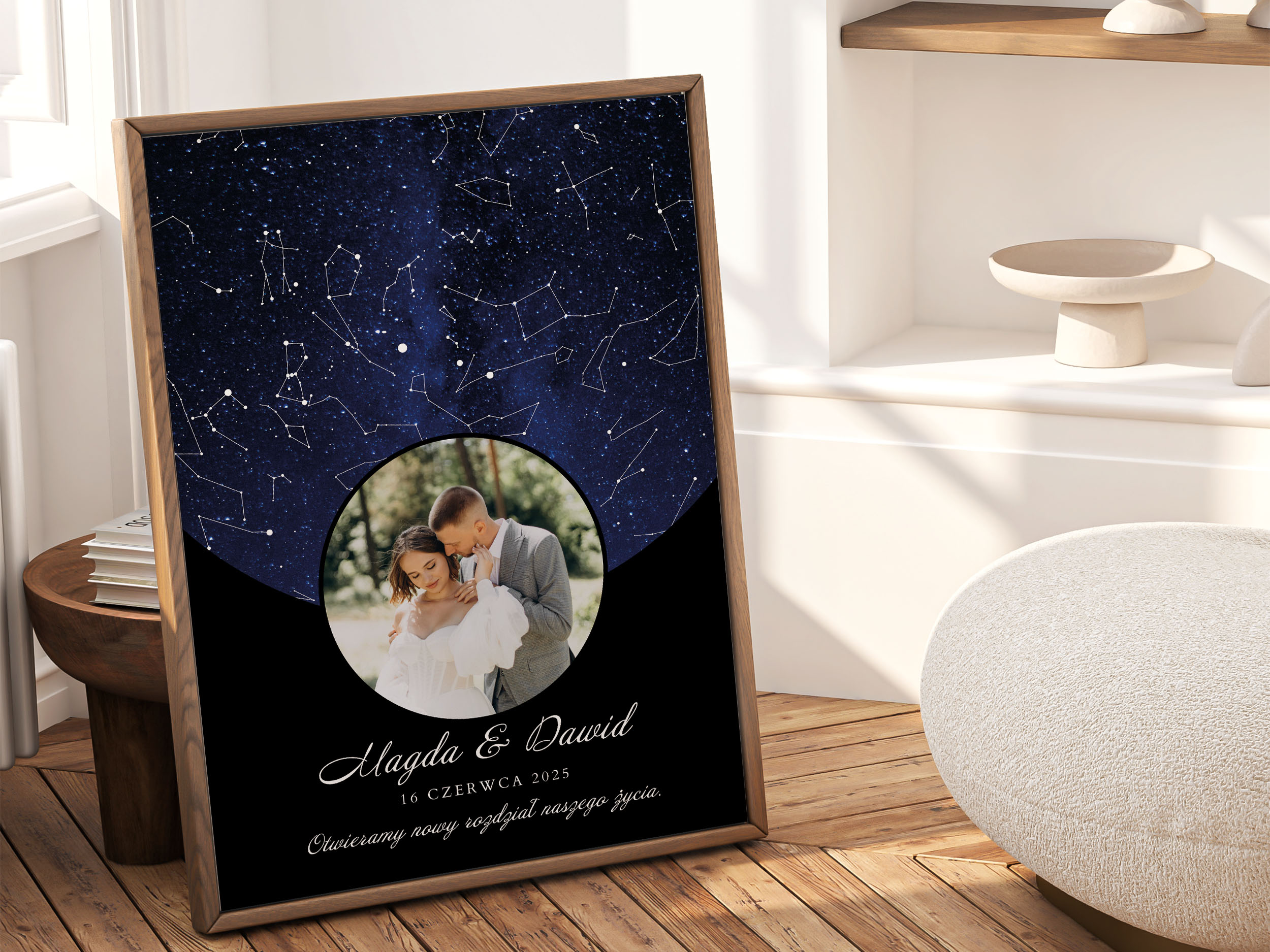 Personalizowany plakat z mapą nieba – romantyczny prezent dla pary i pamiątka wyjątkowego dnia.
