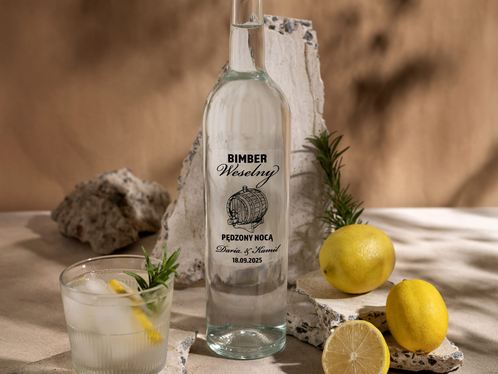 - Stylowy dodatek na stół weselny: Podkreśl elegancję swojej uroczystości, ozdabiając wódkę weselną etykietami dopasowanymi do Twojego motywu weselnego.