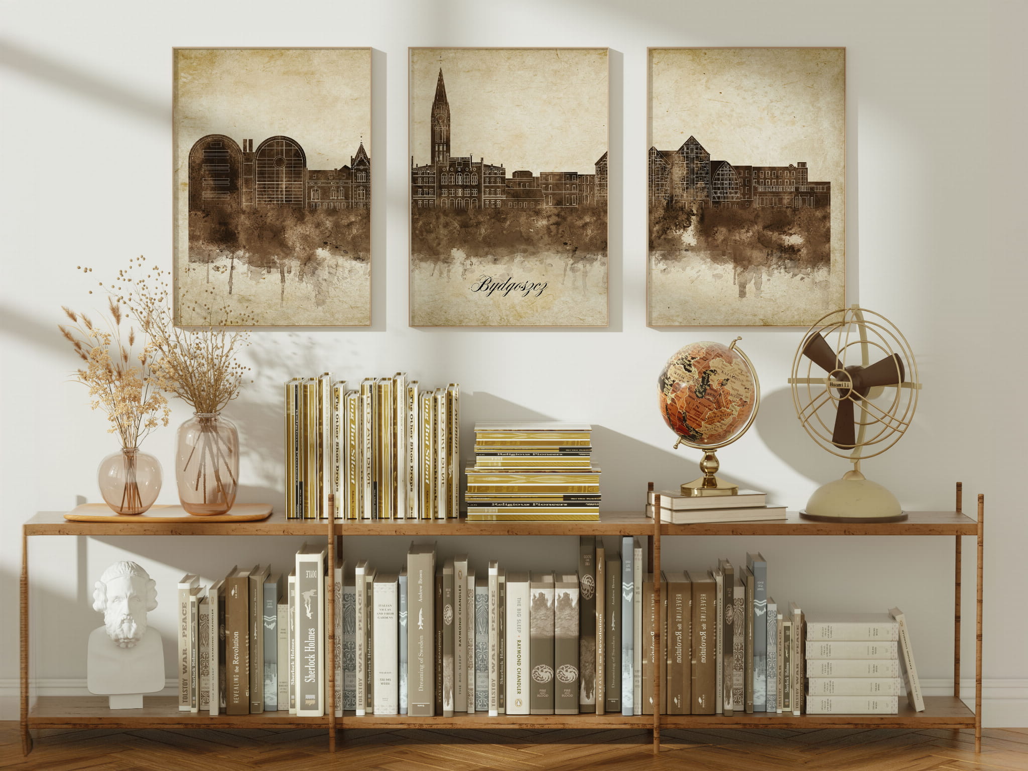 Tryptyki skyline w stylu vintage to nowoczesne dzieła sztuki, które nawiązują do estetyki minionych dekad. Przedstawiają miejskie krajobrazy w retro kolorystyce, z wyblakłymi barwami i z delikatną patyną czasu. Kontury są często zmiękczone, a szczegóły budynków lekko stylizowane, co dodaje im nostalgicznego uroku. Tła plakatów utrzymane są w odcieniach przypominających stary papier, z subtelnymi teksturami i ciepłymi, przygaszonymi tonami. Całość tworzy elegancki i przytulny klimat, idealny do wnętrz, które łączą nowoczesność z klasycznym wdziękiem.