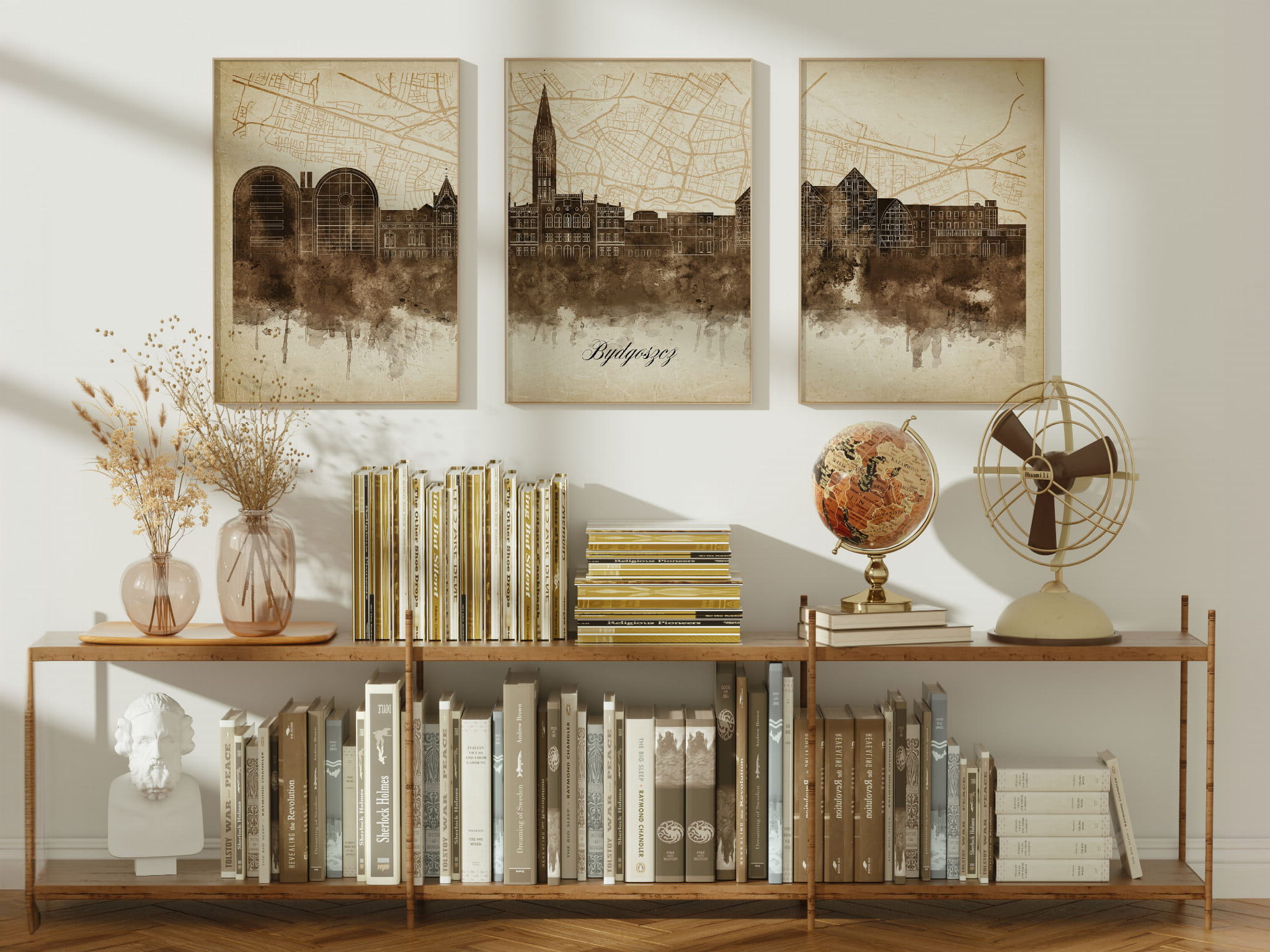 Tryptyki skyline w stylu vintage to nowoczesne dzieła sztuki, które nawiązują do estetyki minionych dekad. Przedstawiają miejskie krajobrazy w retro kolorystyce, z wyblakłymi barwami i z delikatną patyną czasu. Kontury są często zmiękczone, a szczegóły budynków lekko stylizowane, co dodaje im nostalgicznego uroku. Tła plakatów utrzymane są w odcieniach przypominających stary papier, z subtelnymi teksturami i ciepłymi, przygaszonymi tonami. Całość tworzy elegancki i przytulny klimat, idealny do wnętrz, które łączą nowoczesność z klasycznym wdziękiem.