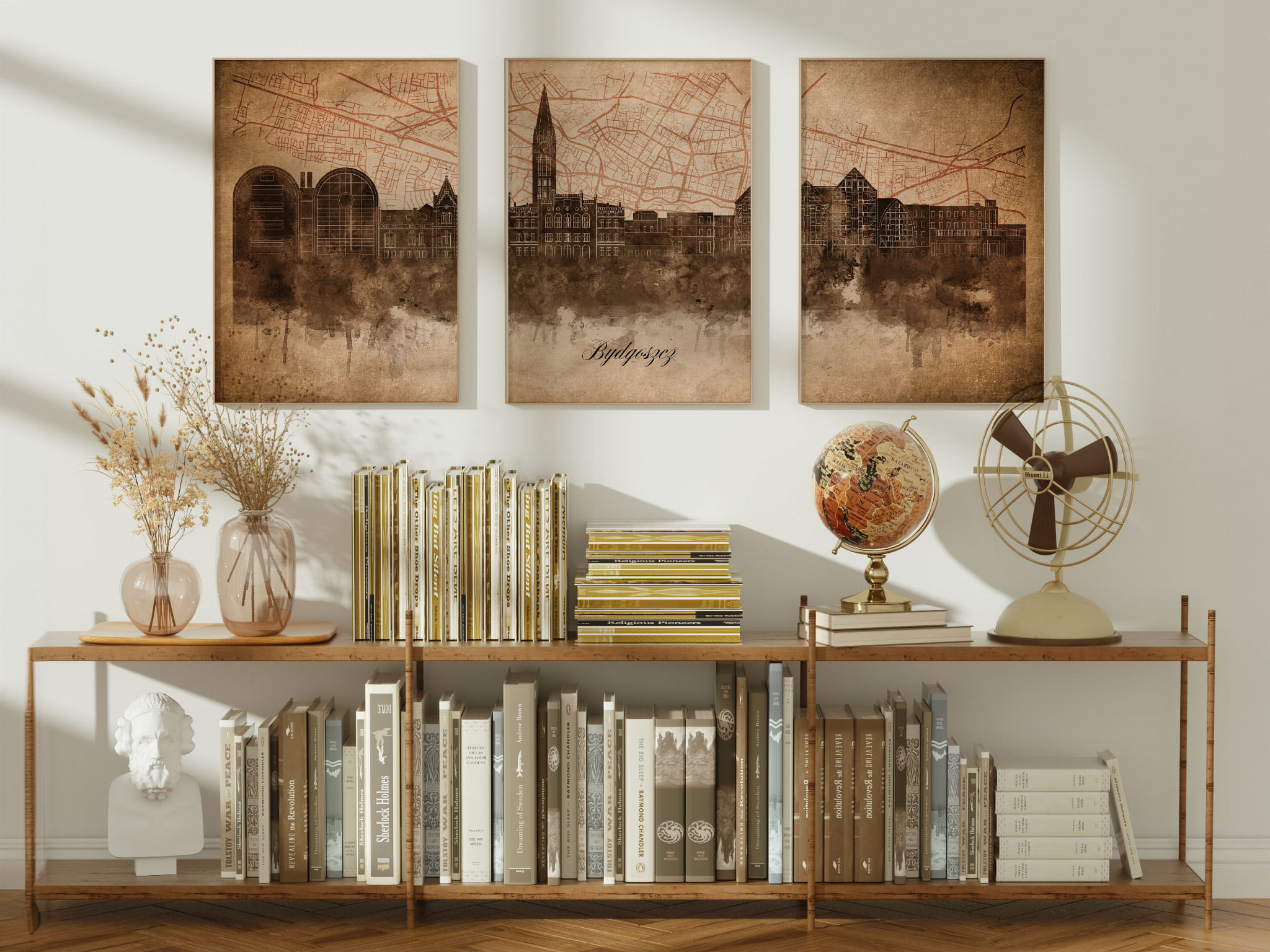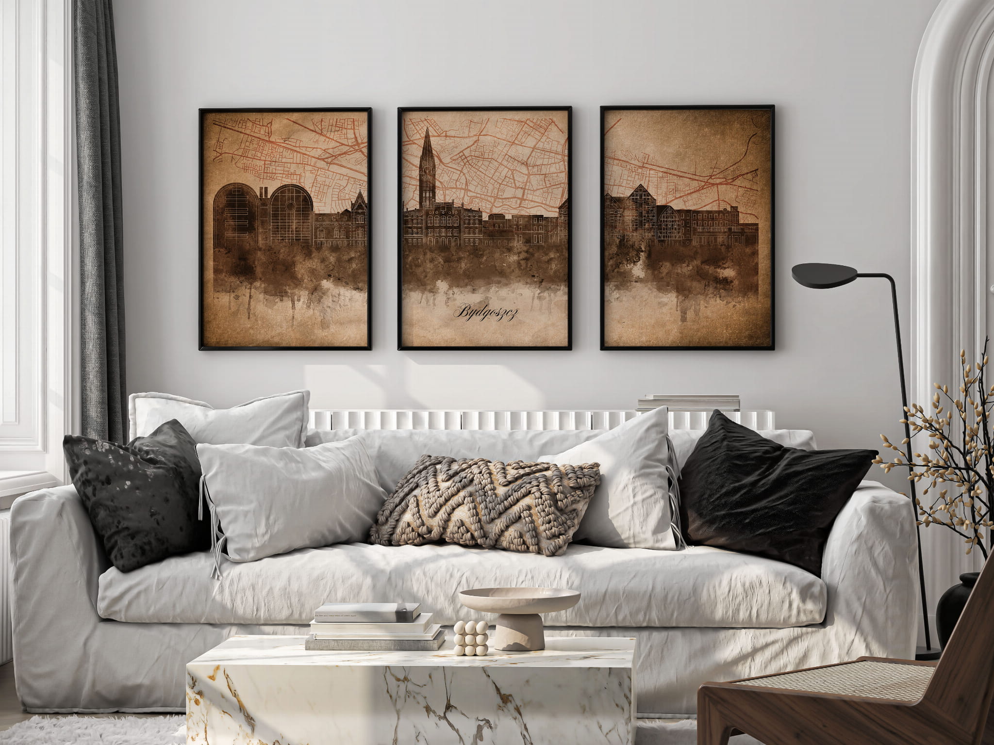 Tryptyki skyline w stylu vintage to nowoczesne dzieła sztuki, które nawiązują do estetyki minionych dekad. Przedstawiają miejskie krajobrazy w retro kolorystyce, z wyblakłymi barwami i z delikatną patyną czasu. Kontury są często zmiękczone, a szczegóły budynków lekko stylizowane, co dodaje im nostalgicznego uroku. Tła plakatów utrzymane są w odcieniach przypominających stary papier, z subtelnymi teksturami i ciepłymi, przygaszonymi tonami. Całość tworzy elegancki i przytulny klimat, idealny do wnętrz, które łączą nowoczesność z klasycznym wdziękiem.