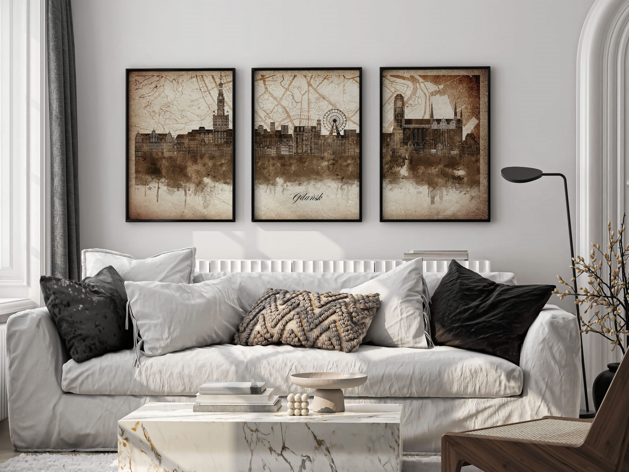 Tryptyki skyline w stylu vintage to nowoczesne dzieła sztuki, które nawiązują do estetyki minionych dekad. Przedstawiają miejskie krajobrazy w retro kolorystyce, z wyblakłymi barwami i z delikatną patyną czasu. Kontury są często zmiękczone, a szczegóły budynków lekko stylizowane, co dodaje im nostalgicznego uroku. Tła plakatów utrzymane są w odcieniach przypominających stary papier, z subtelnymi teksturami i ciepłymi, przygaszonymi tonami. Całość tworzy elegancki i przytulny klimat, idealny do wnętrz, które łączą nowoczesność z klasycznym wdziękiem.