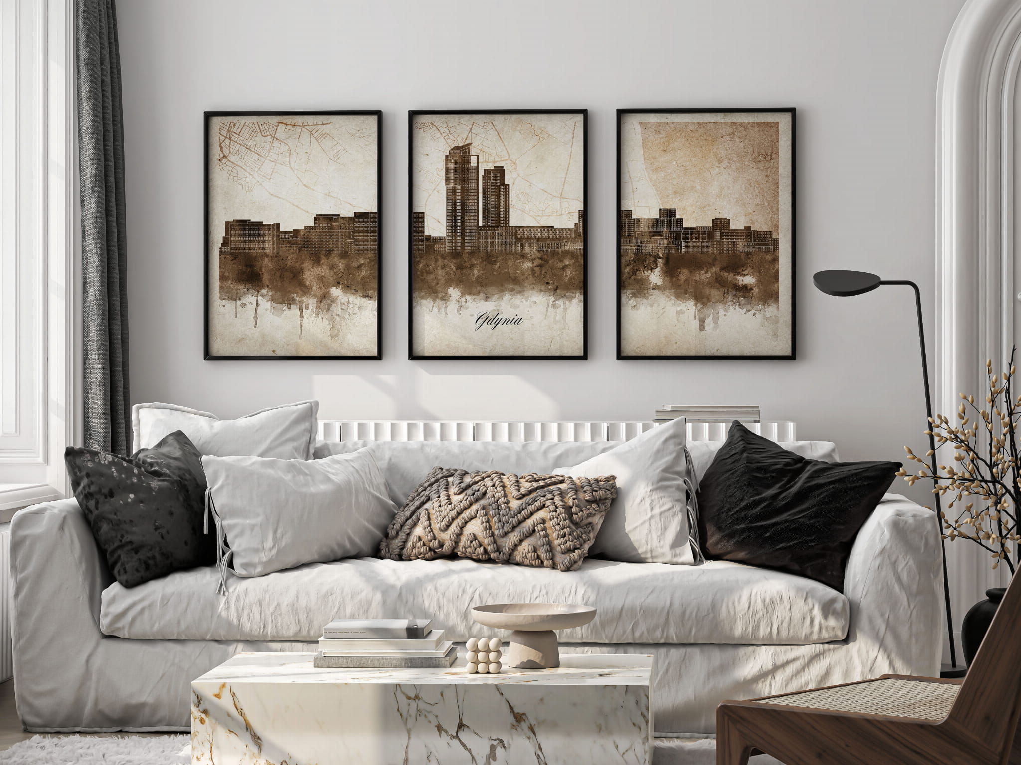 Tryptyki skyline w stylu vintage to nowoczesne dzieła sztuki, które nawiązują do estetyki minionych dekad. Przedstawiają miejskie krajobrazy w retro kolorystyce, z wyblakłymi barwami i z delikatną patyną czasu. Kontury są często zmiękczone, a szczegóły budynków lekko stylizowane, co dodaje im nostalgicznego uroku. Tła plakatów utrzymane są w odcieniach przypominających stary papier, z subtelnymi teksturami i ciepłymi, przygaszonymi tonami. Całość tworzy elegancki i przytulny klimat, idealny do wnętrz, które łączą nowoczesność z klasycznym wdziękiem.