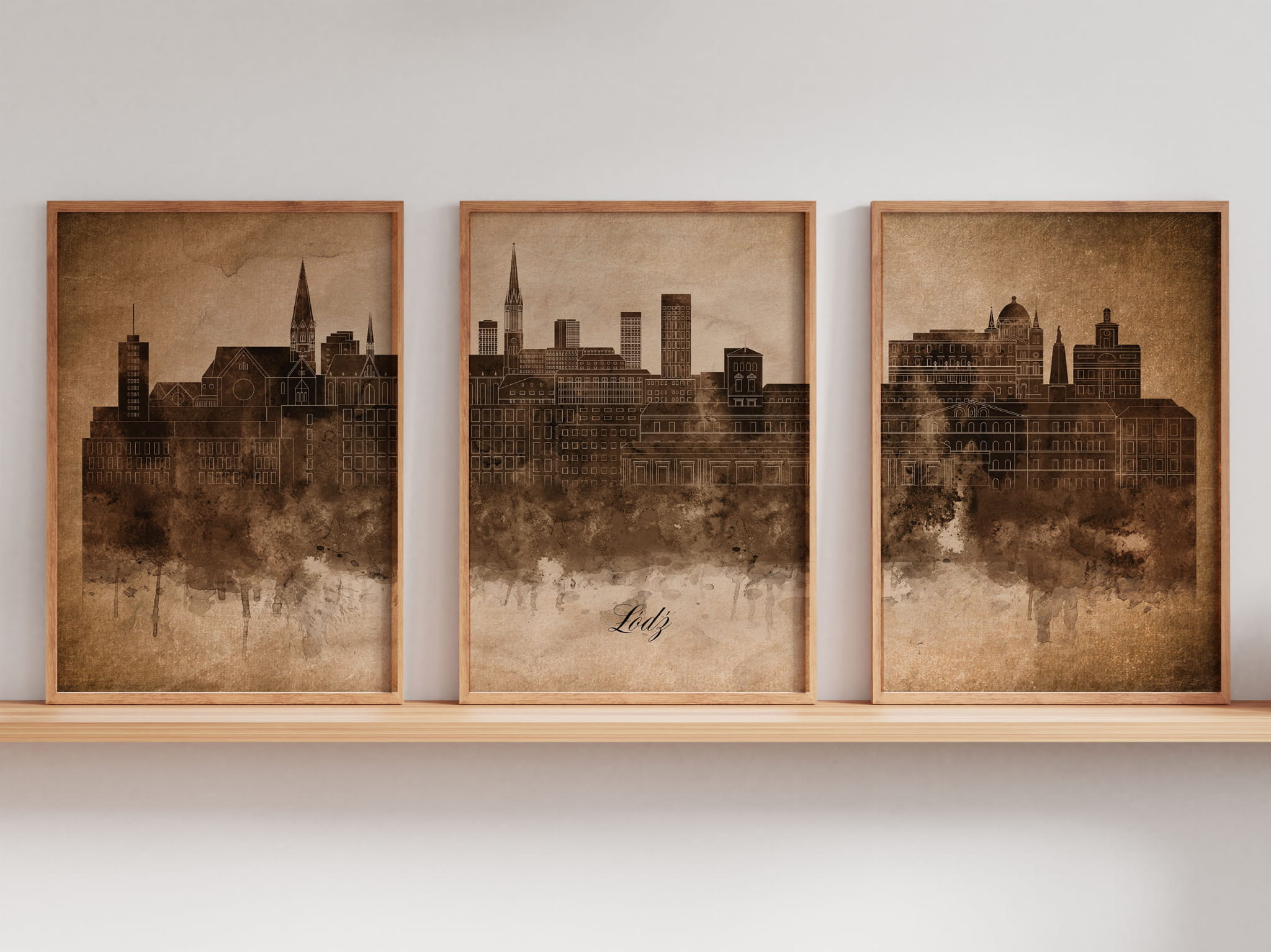 Tryptyk Skylines Łódź w stylu Vintage, Styl akwarelowy