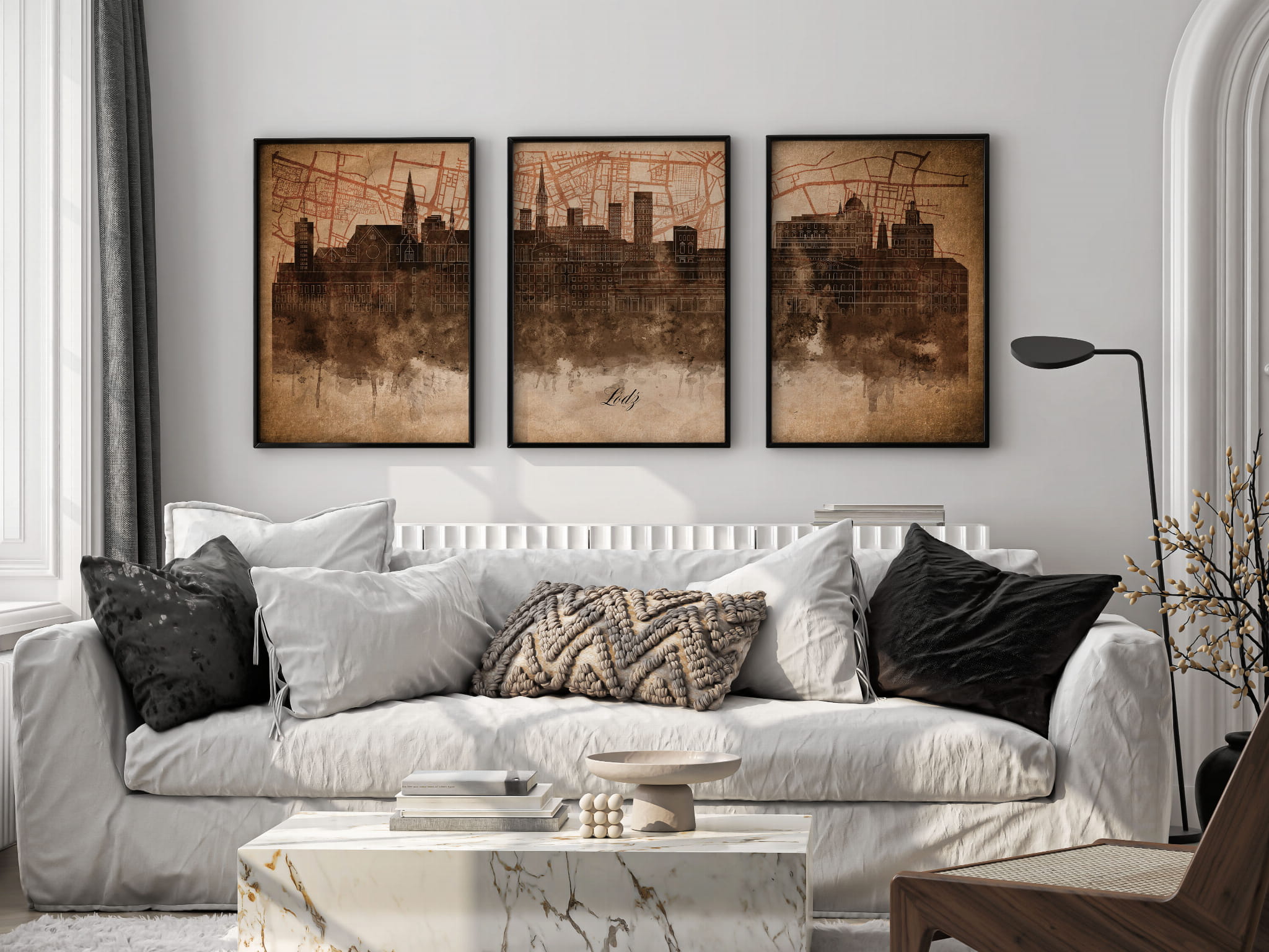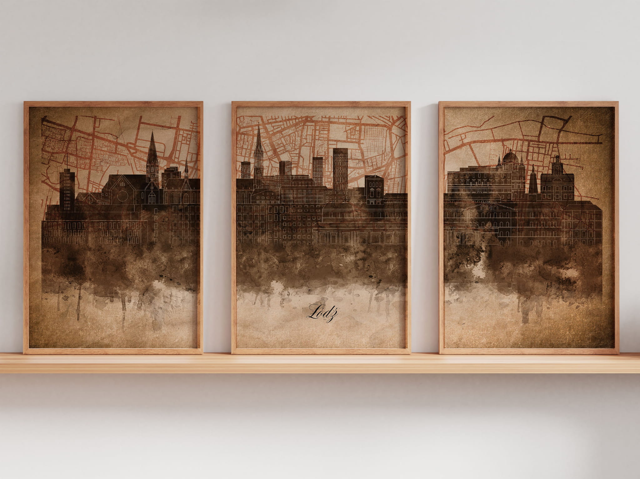 Tryptyk Skylines Łódź w stylu Vintage, Styl akwarelowy