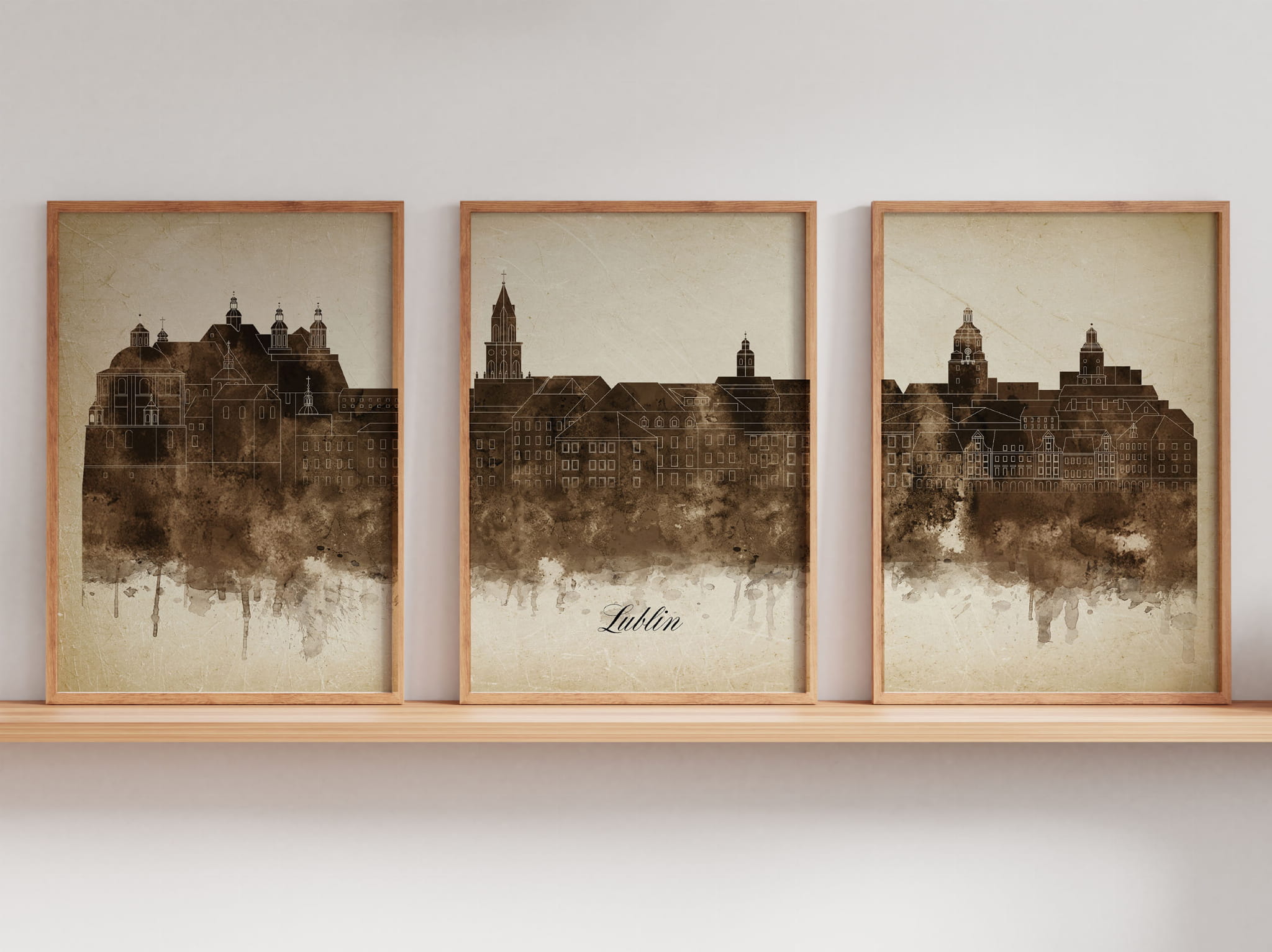 Tryptyk Skylines Lublin w stylu Vintage, Styl akwarelowy