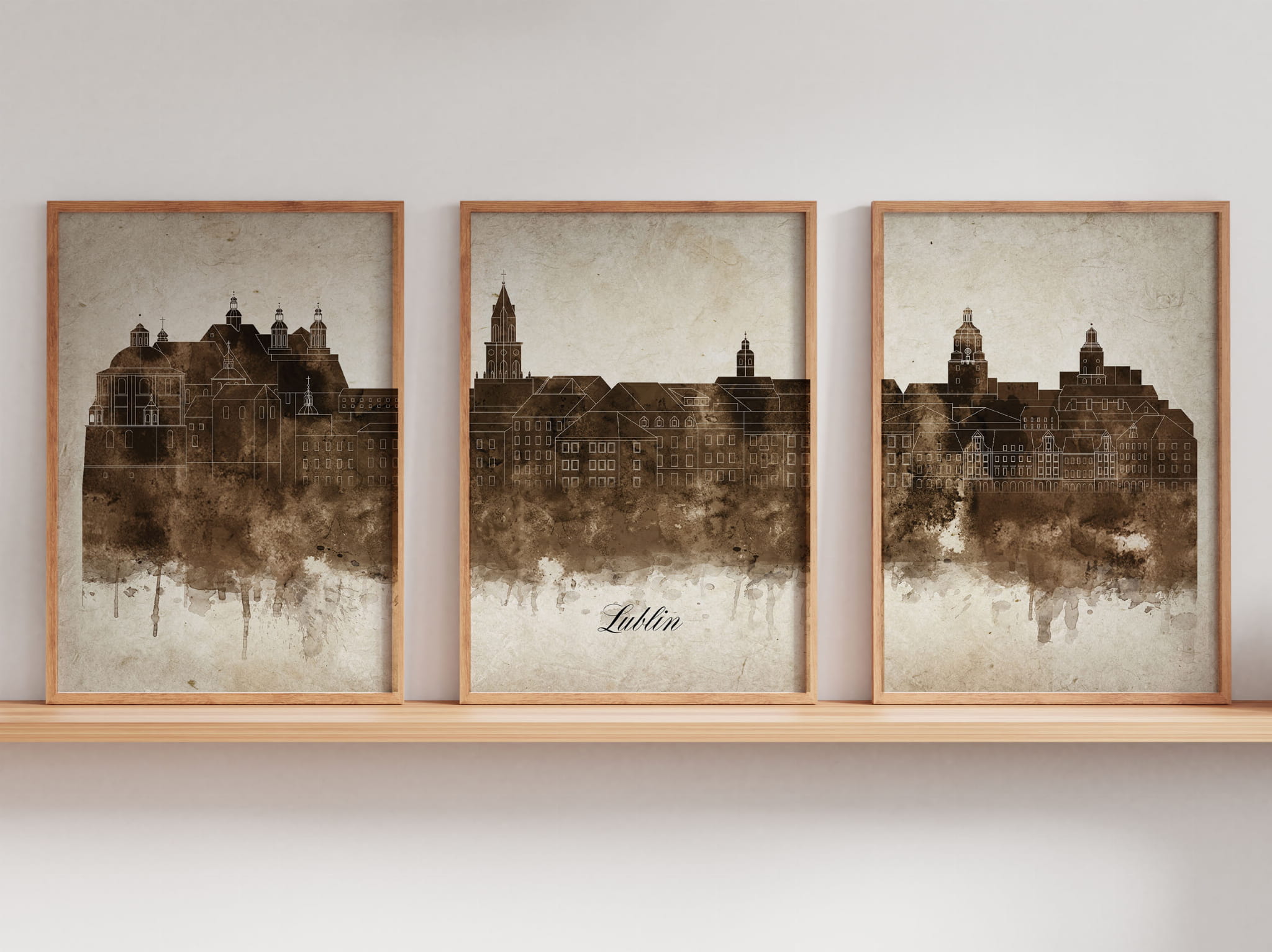 Tryptyk Skylines Lublin w stylu Vintage, Styl akwarelowy