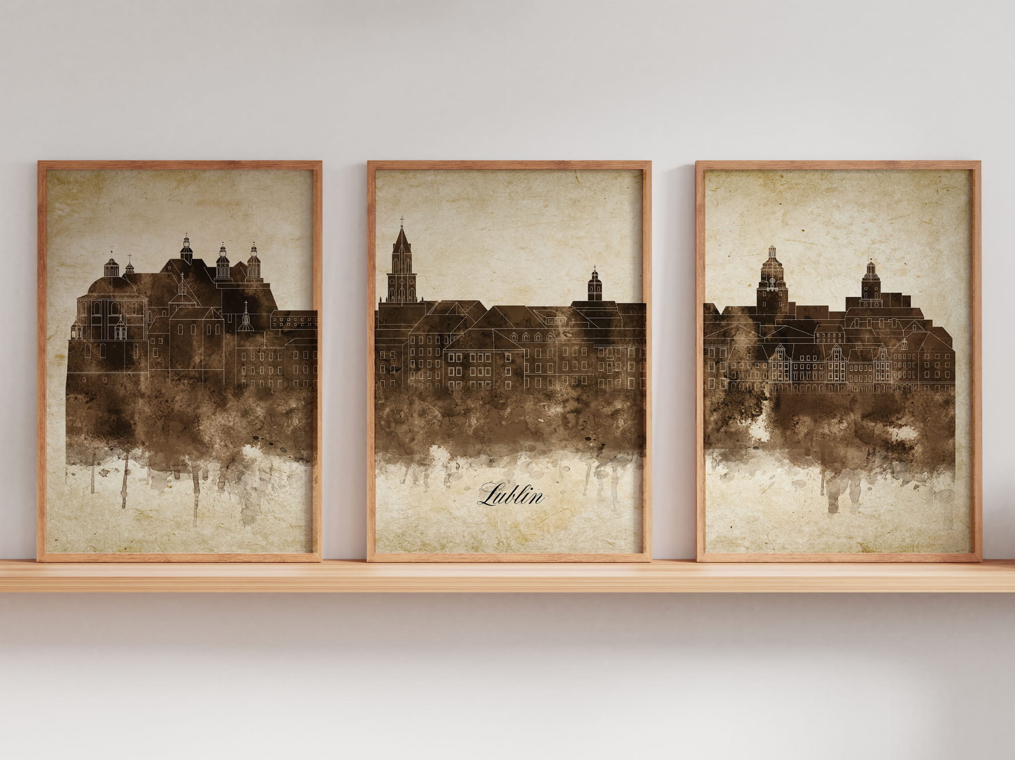 Tryptyk Skylines Lublin w stylu Vintage, Styl akwarelowy