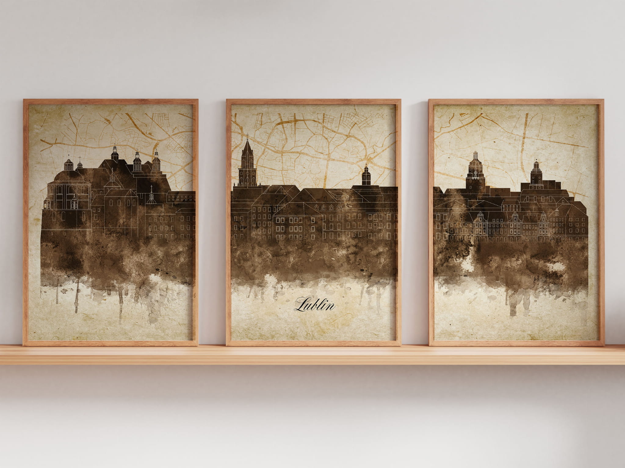 Tryptyk Skylines Lublin w stylu Vintage, Styl akwarelowy