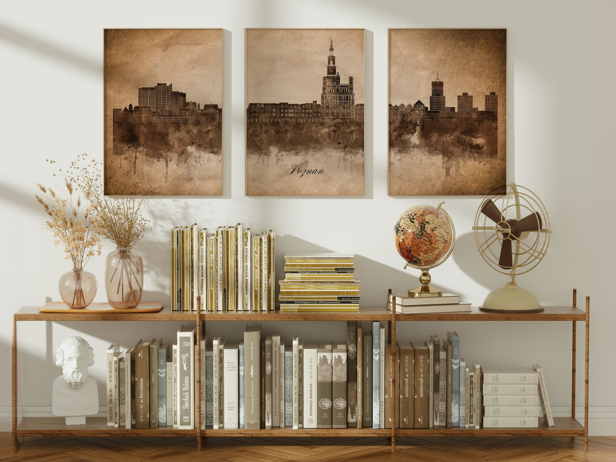 Tryptyki skyline w stylu vintage to nowoczesne dzieła sztuki, które nawiązują do estetyki minionych dekad. Przedstawiają miejskie krajobrazy w retro kolorystyce, z wyblakłymi barwami i z delikatną patyną czasu. Kontury są często zmiękczone, a szczegóły budynków lekko stylizowane, co dodaje im nostalgicznego uroku. Tła plakatów utrzymane są w odcieniach przypominających stary papier, z subtelnymi teksturami i ciepłymi, przygaszonymi tonami. Całość tworzy elegancki i przytulny klimat, idealny do wnętrz, które łączą nowoczesność z klasycznym wdziękiem.