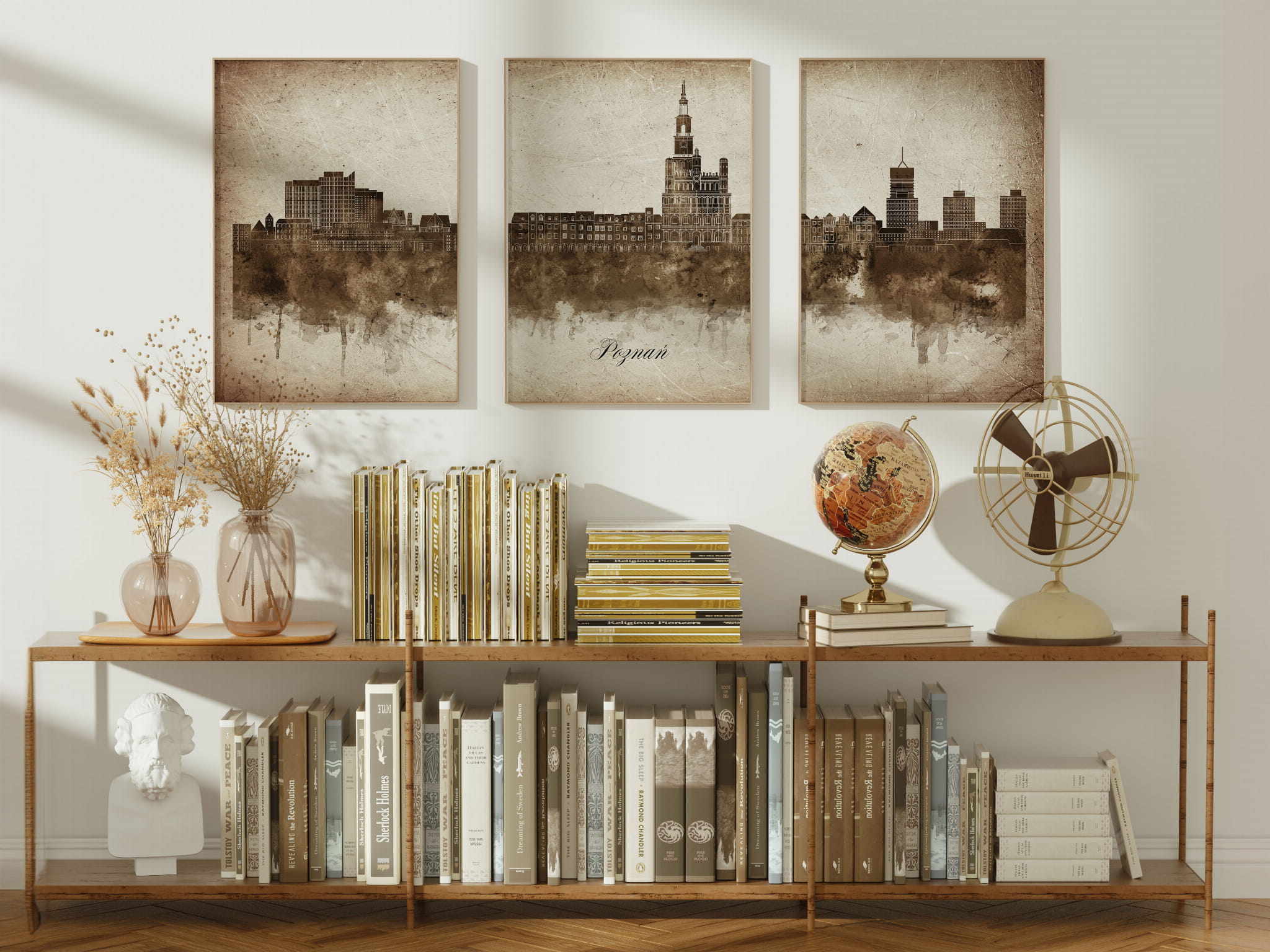 Tryptyki skyline w stylu vintage to nowoczesne dzieła sztuki, które nawiązują do estetyki minionych dekad. Przedstawiają miejskie krajobrazy w retro kolorystyce, z wyblakłymi barwami i z delikatną patyną czasu. Kontury są często zmiękczone, a szczegóły budynków lekko stylizowane, co dodaje im nostalgicznego uroku. Tła plakatów utrzymane są w odcieniach przypominających stary papier, z subtelnymi teksturami i ciepłymi, przygaszonymi tonami. Całość tworzy elegancki i przytulny klimat, idealny do wnętrz, które łączą nowoczesność z klasycznym wdziękiem.